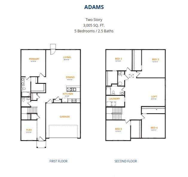 MLS# 21095464 - Built by NHC - Ready Now! ~ The Adams Plan from our Liberty Series offers an unbeatable combination of style, space, and affordability. This spacious 2-story home features 5 bedrooms, 2.5 bathrooms, a 2-car garage, and 3,005 square feet of thoughtfully designed living space. Step into the versatile flex room - ideal for a home office or sitting area. Continue past the staircase and convenient half bathroom to the bright and open kitchen with a pantry and central island, perfectly positioned to overlook the dining area and spacious living room. The main-level primary suite is your private retreat, featuring a large walk-in closet and an en suite bathroom complete with a dual vanity and tub,shower combination. Upstairs, you'll find four additional bedrooms, a full bathroom, a spacious loft, and a conveniently located laundry room.