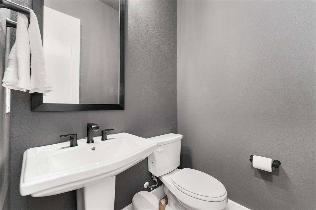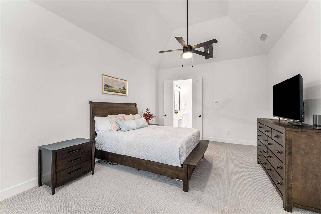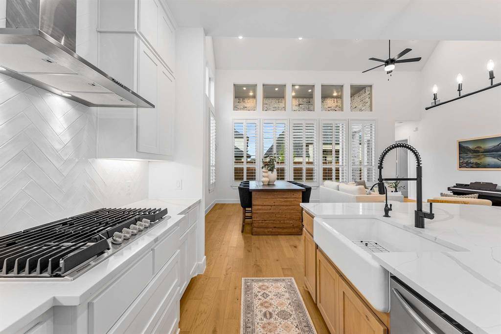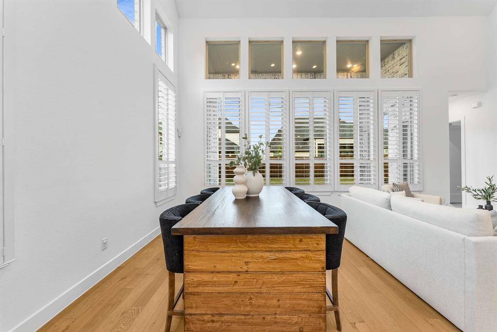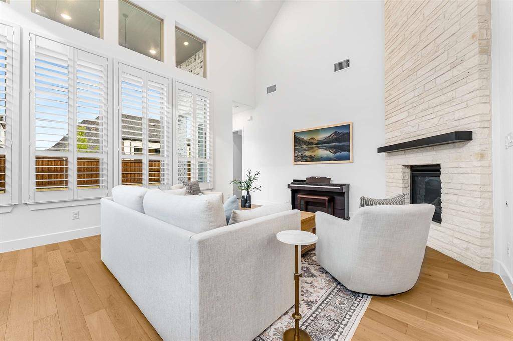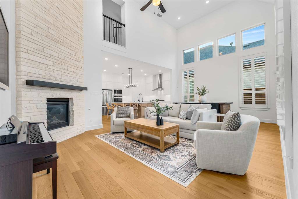 Located in the highly desirable Mosaic community and built by Highland Homes, this move-in ready, two-story residence offers 5 bedrooms, 5 full baths, and 2 half baths with thoughtfully designed living space in top-rated Prosper ISD. The main level features soaring ceilings, abundant natural light, and an open-concept layout ideal for modern living. Highlights include a dedicated home office, media room, and an oversized primary suite with sitting area, freestanding tub, large walk-in shower, and double vanities. A secondary first-floor bedroom with full bath and an additional half bath provide excellent flexibility for guests or multi-generational living. The gourmet kitchen showcases quartz countertops, extended white oak cabinetry, double ovens, and a spacious island, flowing seamlessly into the family room with a wall of windows and dramatic two-story fireplace, creating an inviting space for everyday living and entertaining. Upstairs, a large game room and flexible lifestyle room offer options for a second office, playroom, or creative studio, along with an additional half bath for convenience. Recent upgrades include whole-house water filtration, plantation shutters, extended wood flooring, and a security system with cameras. Additional features include a slab foundation, tankless water heater, and original roof and HVAC systems installed at construction in 2024, supporting energy efficiency and low-maintenance living. The extended covered patio enhances outdoor living, while the three-car garage provides ample storage. Mosaic residents enjoy access to 47 acres of green space, parks, trails, fishing piers, and two amenity centers with pools and a lazy river. With an on-site elementary school and convenient access to the Dallas North Tollway, downtown Celina, Frisco, and the greater DFW area, this home offers the perfect blend of luxury, lifestyle, and location.