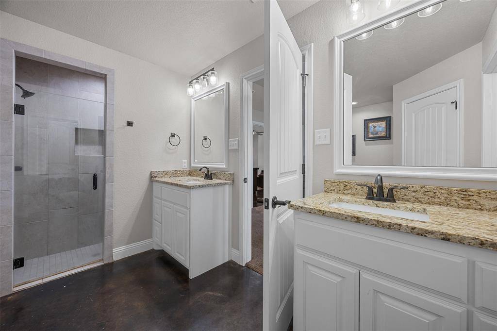 The primary suite is a dream with its rare wrap-around closet, spa-like ensuite bath, and abundant natural light. Stained concrete floors throughout the main areas create a warm, rustic feel, while new carpet in the bedrooms adds a touch of comfort and coziness.