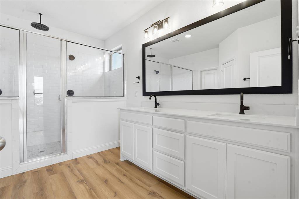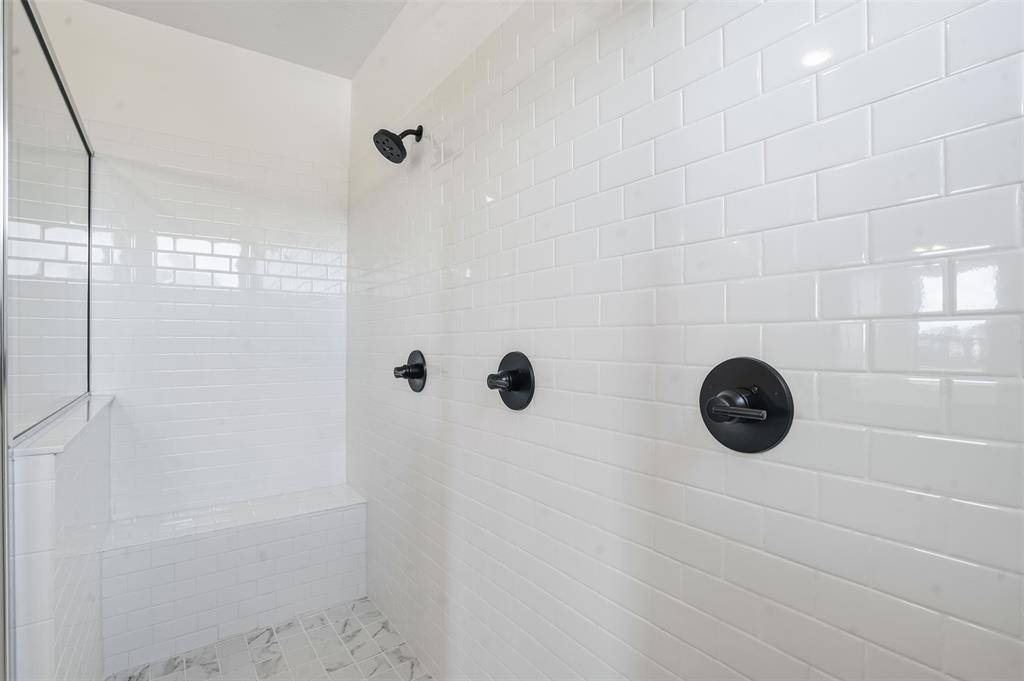 The primary suite is tucked away for privacy and includes a spa-inspired bathroom with a large double shower, dual sinks, and carefully selected designer tile finishes. Throughout the home, designer lighting and curated finishes add polish without feeling overdone.