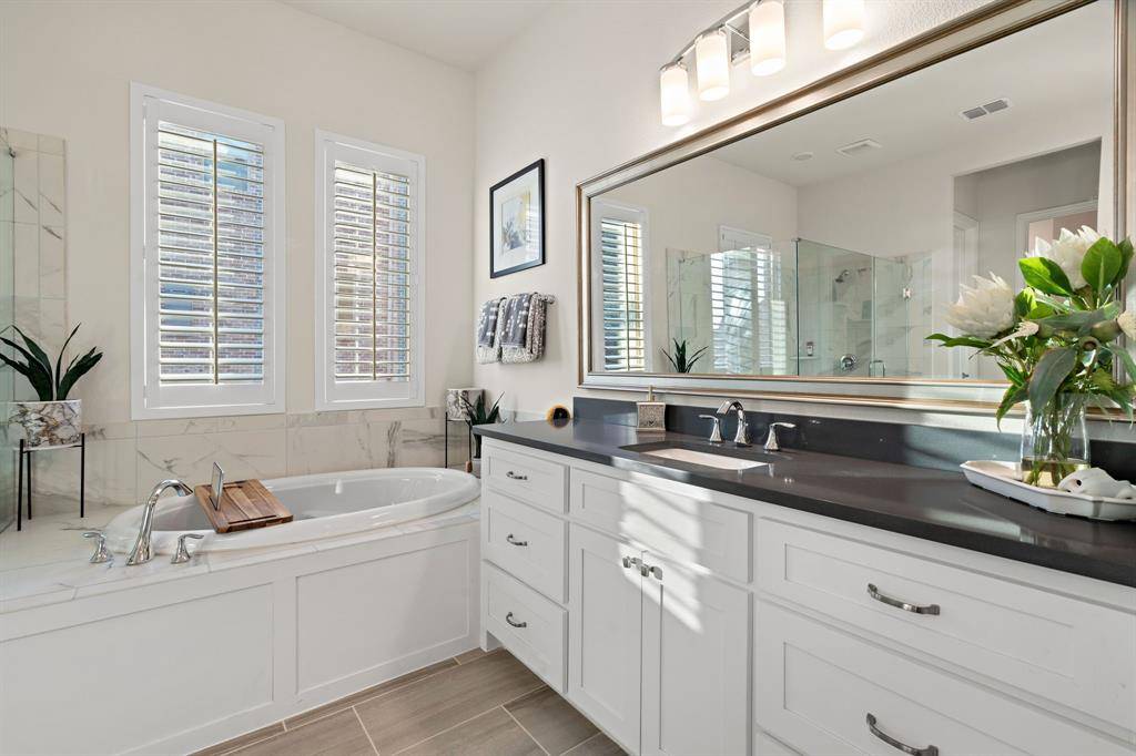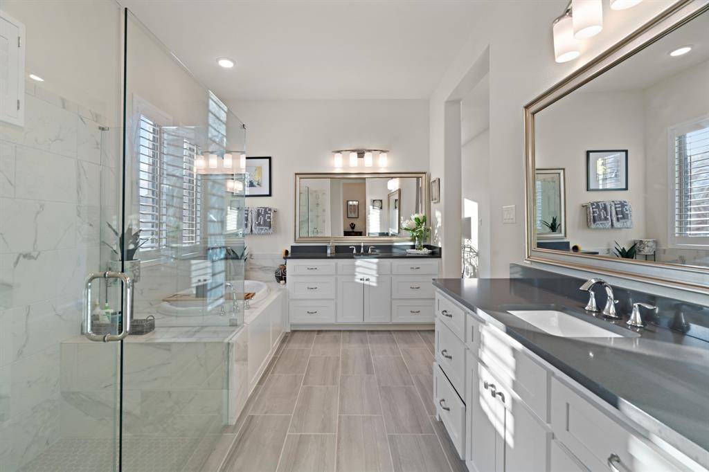 The primary suite offers a private retreat, and the en-suite bath is highlighted by an oversized shower and generous space. One of the standout features of this home is the indoor-outdoor connection—panoramic sliding glass doors open to an oversized patio, extending the living space and creating an ideal setting for relaxing or hosting guests.