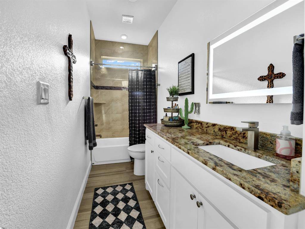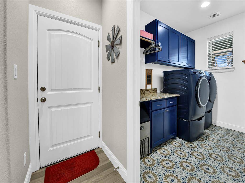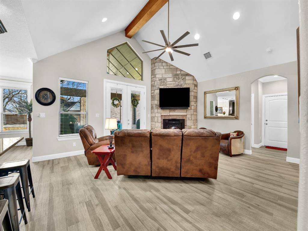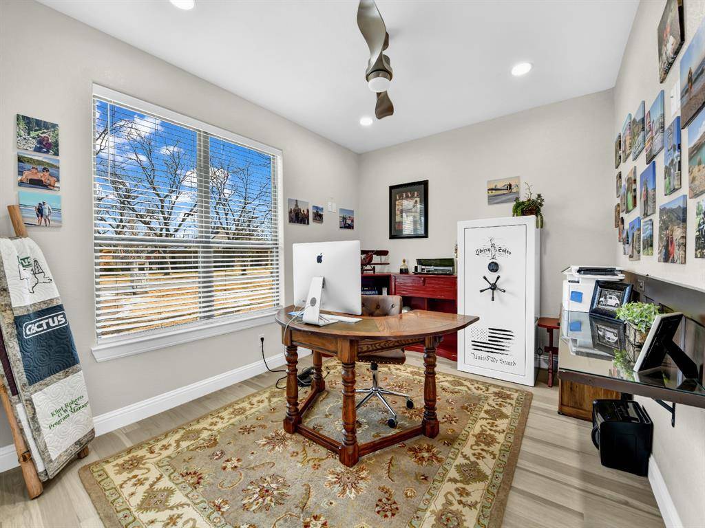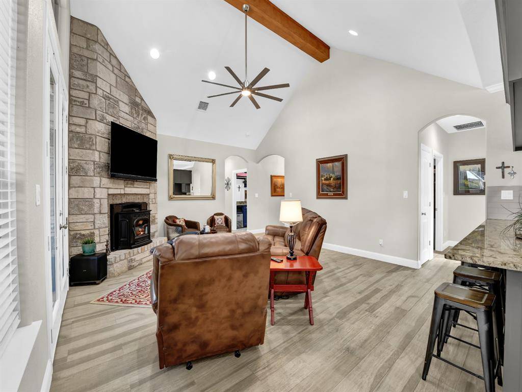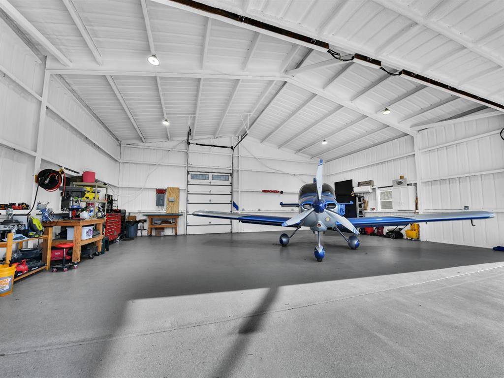 Exceptional home in Pecan Plantation featuring a private hangar with additional storage and direct taxiway access to Pecan 0TX1 runway. This thoughtfully upgraded property offers an open floor plan, split-bedroom arrangement, and blends modern luxury with an aviation lifestyle. The heart of the home is the high-end kitchen with Café appliances, granite countertops, and new kitchen sink (2026). Custom cabinetry with soft-close hinges and pull-out drawer slides maximizes functionality, while a built-in ice maker in the laundry room adds convenience. The open living area features a pellet stove fireplace with auto-feeder and temperature regulator. The entire home is foam insulated for year-round comfort and features ceramic wood-look tile throughout with no carpet. The split-bedroom layout provides privacy, with the primary suite serving as a true retreat. It features a vaulted ceiling, a walk-in closet with custom built-in drawers & cabinetry, and a spa-like bath with dual sinks, lighted anti-fog mirrors, a large walk-in shower, and soaking tub. Upstairs, a large private bedroom with a full bath offers the perfect setup for guests or flexible living. Step outside to the impressive,oversized screened (2025) back patio that is designed for year-round enjoyment. The patio features a vaulted ceiling, oversized ceiling fan, & two separate entry and exit doors. Perfectly positioned on a corner lot with circle driveway. Hangar area has additional concrete parking and attached storage shed for golf cart. The foam-insulated hangar (30 x 42) offers direct taxiway access, dual heat & cool mini-split HVAC systems, Epoxy flooring (2025), built-in storage, and a battery-operated door opener with remote. Recent updates include cement driveways (2024), roof replacement (2024), and fresh exterior paint (2026). A rare opportunity to own a meticulously maintained, aviation-ready home in one of Granbury's most desirable gated communities.