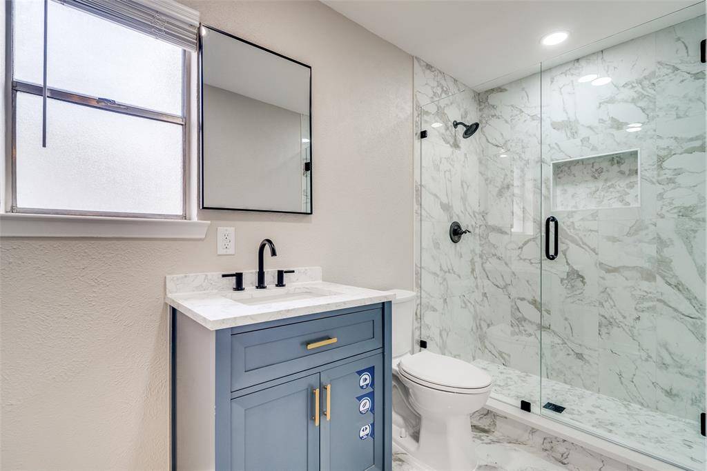 The primary suite includes a remodeled en-suite bathroom with a large walk-in tiled shower and glass enclosure, offering a private retreat.