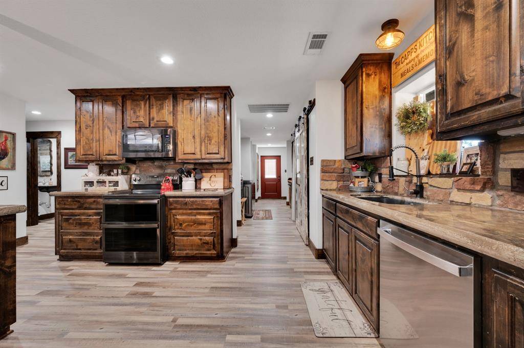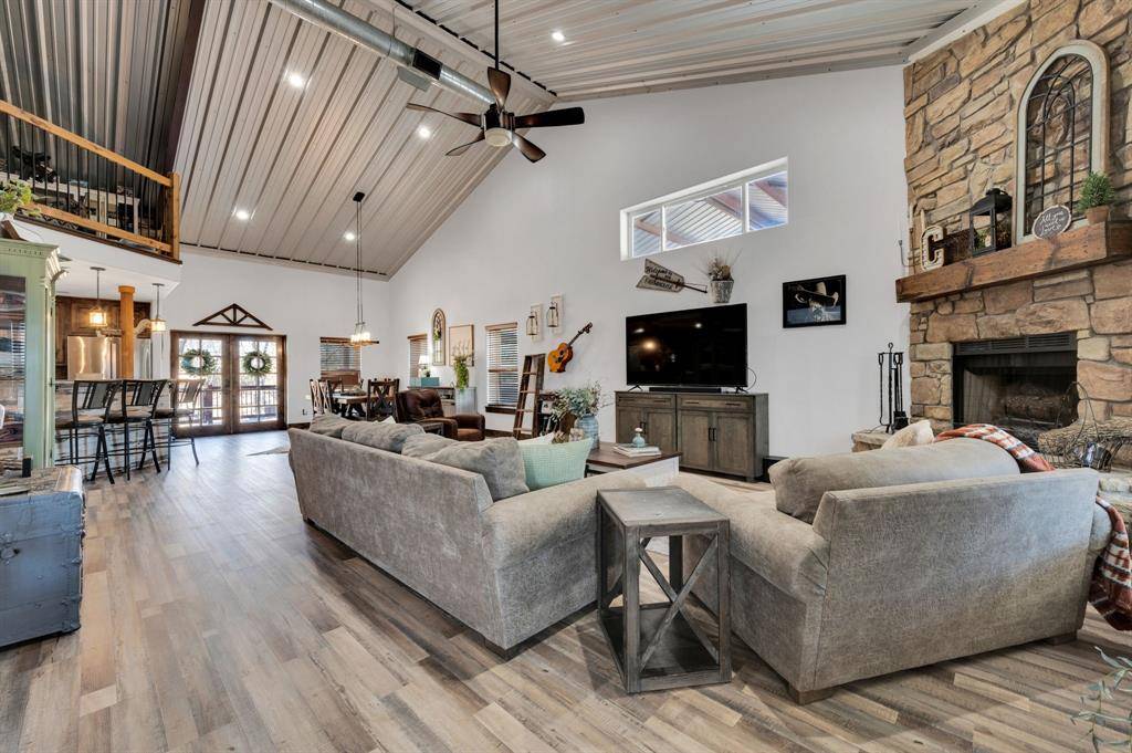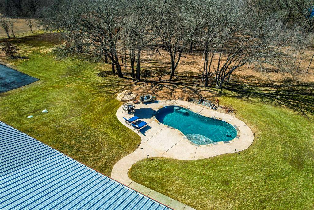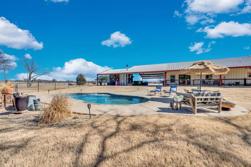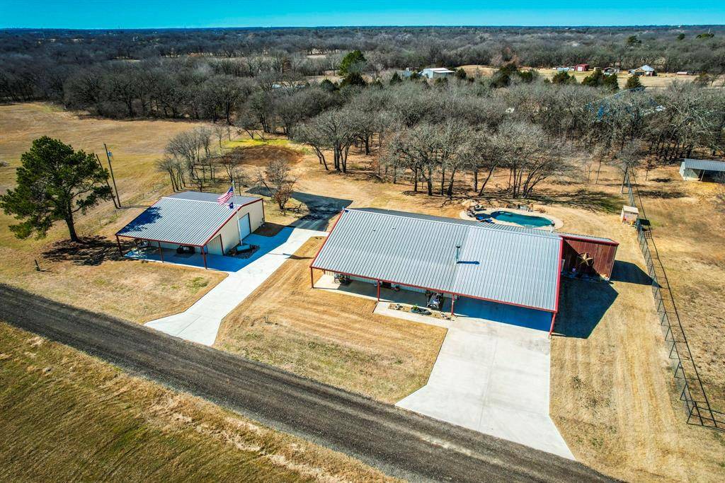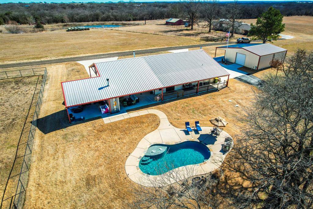 Indulge in refined country luxury at this extraordinary barndominium estate, gracefully set on just under four breathtaking acres at 9824 County Road 305 in Grandview, within the highly acclaimed Grandview Independent School District. Perfectly positioned between Waco and Fort Worth, this remarkable property offers the serenity of small-town living without sacrificing convenience. This is the one you've been waiting for — where timeless luxury meets the freedom of wide-open spaces. Immaculately maintained and designed for both comfort and sophistication, the main residence showcases 3 spacious bedrooms, 2.5 baths, a dedicated office, and two expansive living areas. Inside, a majestic wood-burning fireplace anchors the home with warmth and grandeur, creating an unforgettable focal point for gatherings and cozy evenings alike. Generous attic storage provides exceptional functionality without compromising living space. Step outside into a private resort-style retreat where luxury and leisure meet. The sprawling outdoor living area is an entertainer's dream, featuring a stunning outdoor fireplace, grilling space, relaxing hot tub, and a sparkling pool — all surrounded by towering trees and sweeping views of your horse pasture and barn. Whether hosting lively celebrations or enjoying peaceful Texas sunsets, this outdoor sanctuary delivers an unparalleled lifestyle experience. The impressive shop includes beautifully appointed detached guest quarters complete with a private bedroom, full bath, and comfortable living area — ideal for extended family, guests, or multi-generational living. From the equestrian amenities to the exquisite indoor and outdoor living spaces, this one-of-a-kind property embodies luxury country living at its finest. Rarely does a home offer this level of privacy, elegance, and versatility in such a prime location. Come experience a place where sophistication meets wide-open spaces — and where every detail invites you to stay.