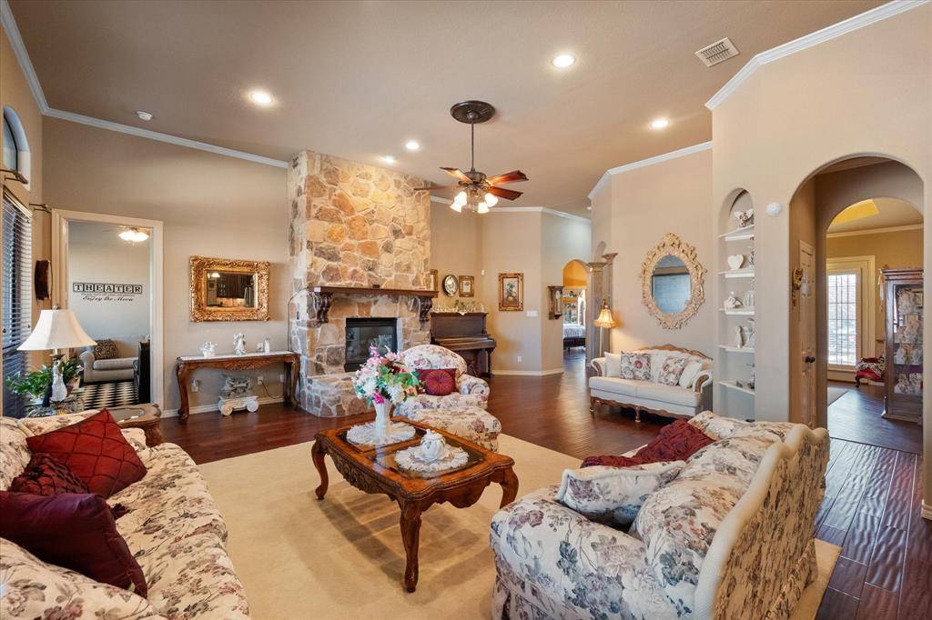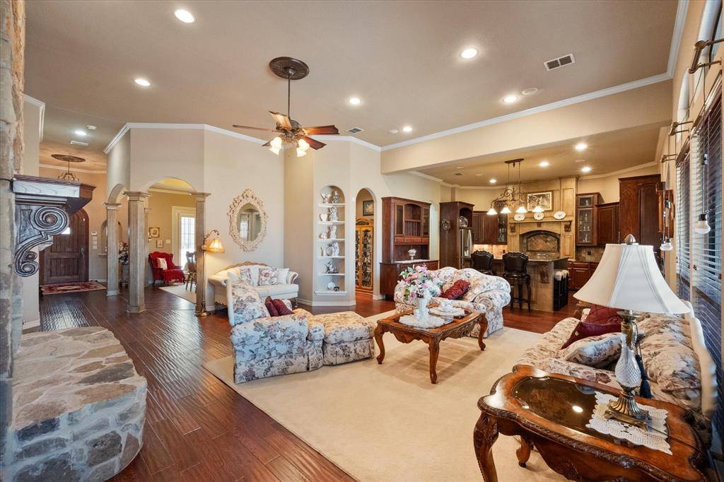 The home showcases custom craftsmanship and detail throughout, beautiful wood flooring, and charming nooks and crannies. The kitchen offers abundant cabinetry, a built-in display hutch, large eat-in island, and opens to the main living space. Large laundry room with additional storage. The primary bath includes a seating area.