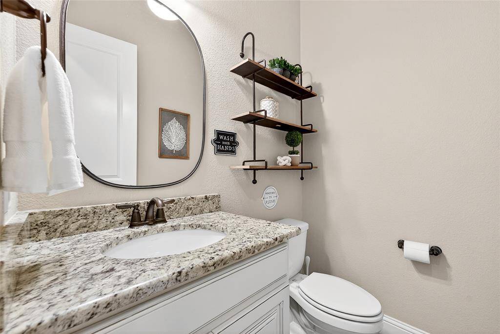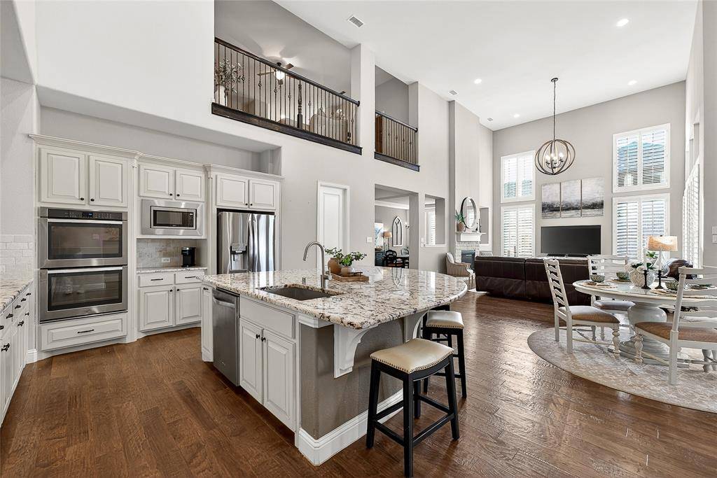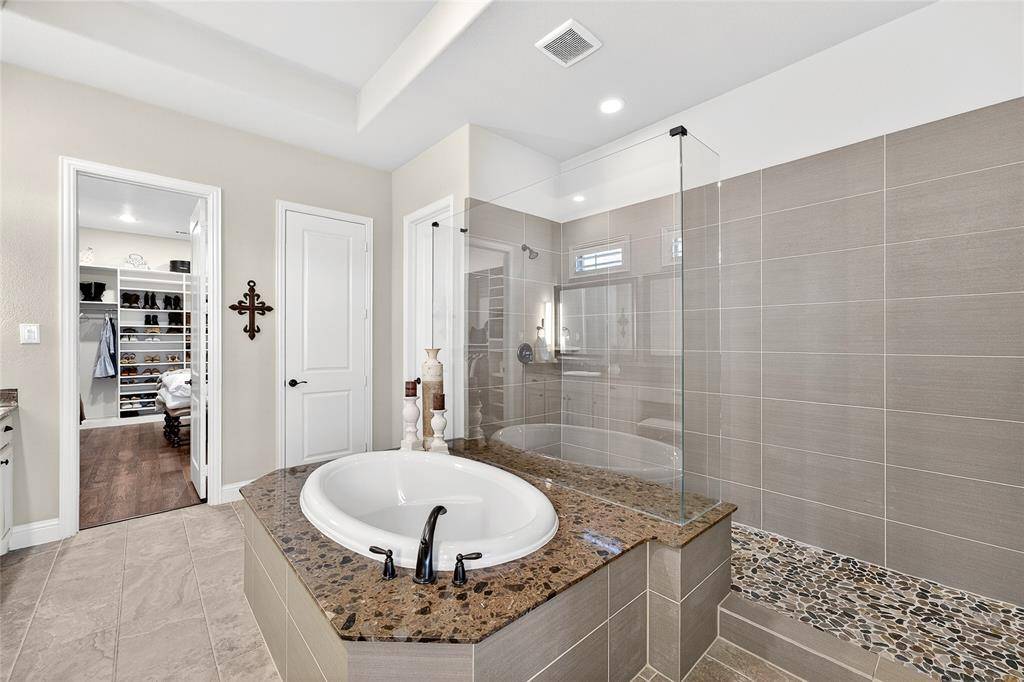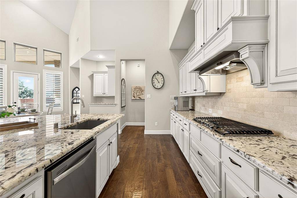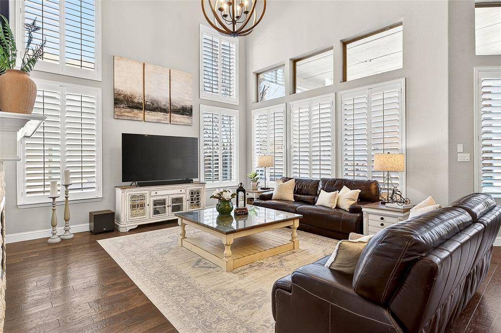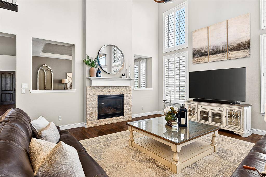 Located in Prosper within Frontier Estates which has no MUD or PID and zoned to Prosper ISD, this thoughtfully designed home offers a flexible floor plan, abundant natural light, and a third-acre lot with space for a future pool.Tall ceilings and oversized windows create an open feel throughout the main living areas. Espresso hardwood floors, custom lighting, and a sweeping spiral staircase add architectural character. The kitchen features a large granite island, marble and granite countertops, gas cooktop, double ovens, custom Hoffman cabinetry, concealed spice storage, and a built-in planning niche. It opens to the living room with a gas fireplace and views of the backyard. The primary suite is located on the main level and includes tray ceilings, a spa-style bath with frameless walk-in shower, soaking tub, stone flooring, private water closet, and a custom walk-in closet. A guest suite with private bath is also on the first floor, along with a dedicated office, mudroom, spacious laundry room, and a flexible bonus room suitable for a gym, nursery, playroom, or additional workspace. Upstairs includes a media room, loft-style living area, and two secondary bedrooms, each with private baths and walk-in closets. The fully fenced backyard sits on approximately one-third of an acre and includes a covered patio with natural gas hookup, offering space for outdoor living and future pool plans. Additional features include spray-foam insulation, smart-home wiring, Wi-Fi thermostats, LED lighting, gas water heaters, irrigation system, under-stair storage, and a three-car garage. Frontier Estates amenities include a community pool, splash pad, walking trails, and convenient access to shopping, dining, and major roadways.