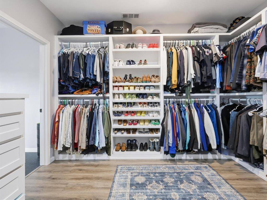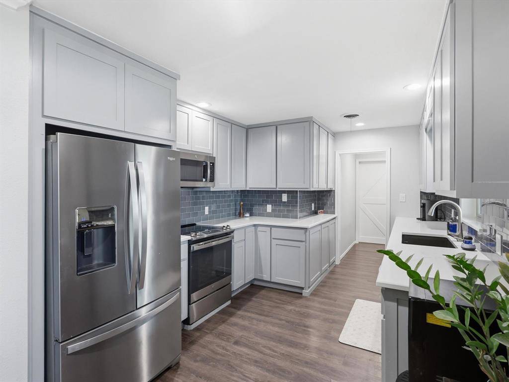 The updated kitchen showcases new appliances including a bar refrigerator, custom cabinetry, quartz countertops and backsplash, a custom pantry with slide-out drawers, and a new sink and disposal. New vinyl hardwood flooring extends throughout much of the home.