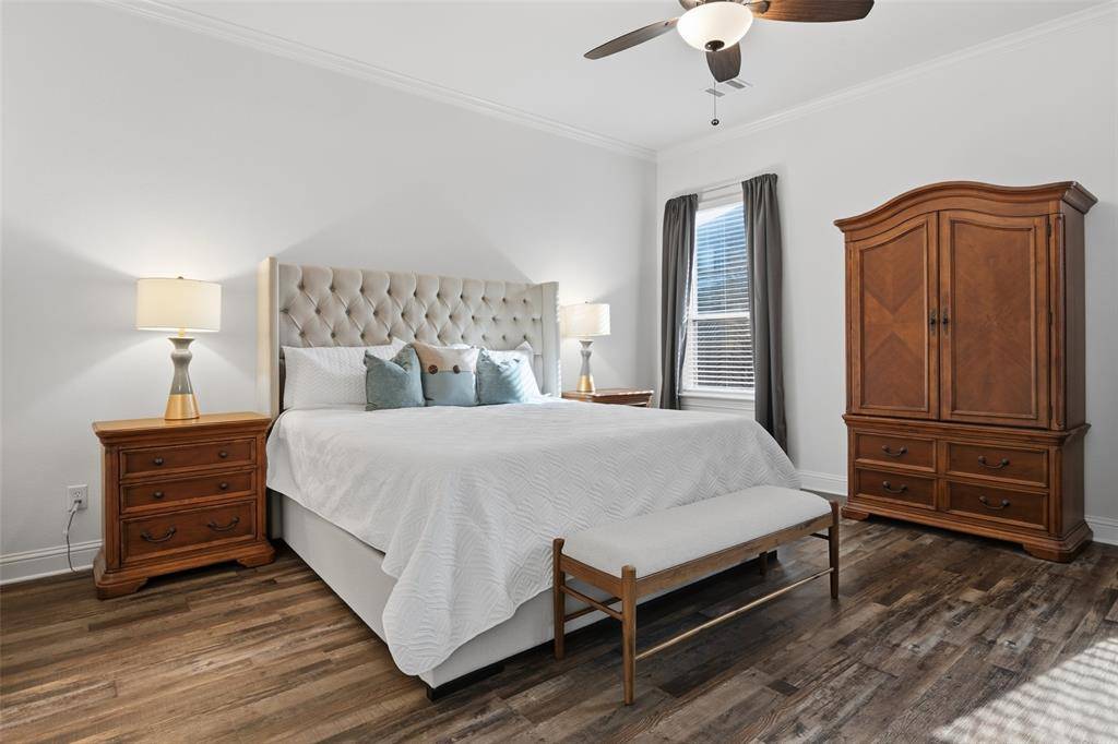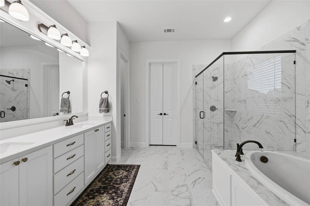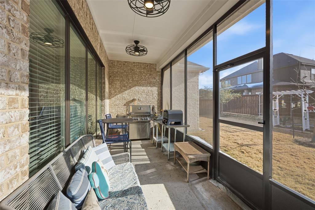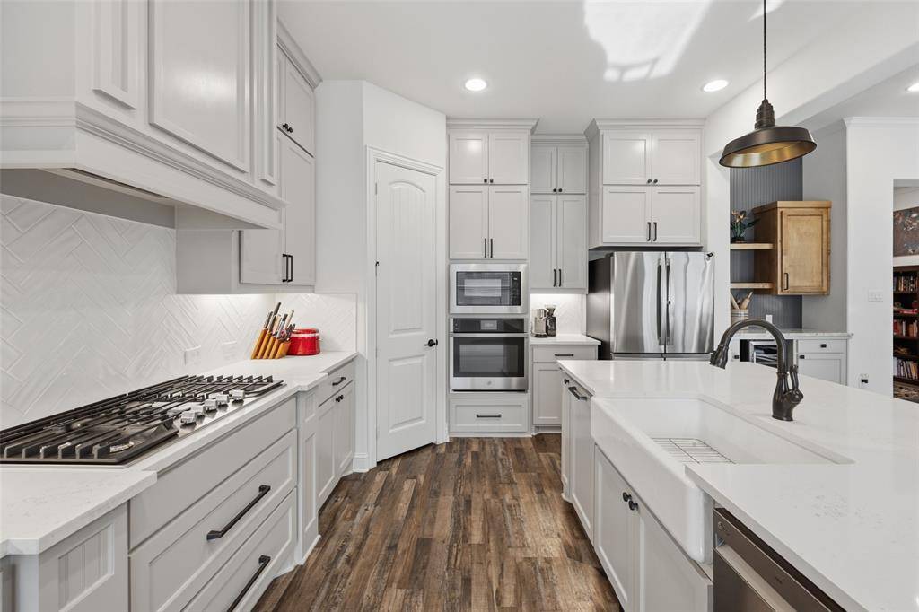 Located in Mansfield's highly desired South Pointe subdivision, this impressive single-story home offers a beautiful blend of modern design and everyday comfort. Upon entry, a welcoming foyer leads into a bright open living space filled with natural light. At the heart of the home is the chef's kitchen, featuring an expansive quartz island with seating, custom cabinetry, a stylish herringbone tile backsplash, a walk-in pantry, and stainless appliances, including a convection oven. The oversized island is perfect for casual dining and overlooks the spacious living room—ideal for entertaining—with a cozy fireplace, built-in bar, and large windows. The primary suite is a true retreat, featuring a spa-like ensuite bathroom with a soaking tub, separate glass-enclosed shower, dual vanities with quartz countertops, and a generous walk-in closet. Three additional well-sized bedrooms, two full bathrooms, and a functional laundry room with built-in cabinetry and counter space provide plenty of room for family or guests. Enjoy outdoor living on the enclosed patio overlooking the fenced backyard, perfect for relaxing or hosting gatherings. An additional front patio off one of the bedrooms adds even more charm and versatility. With thoughtful upgrades, modern finishes, and an exceptional layout, this move-in-ready home is perfect for both everyday living and entertaining.