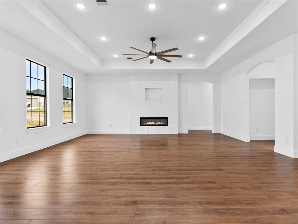 The expansive living room offers plenty of space to gather and unwind, highlighted by a sleek electric fireplace that adds warmth and ambiance to the space.