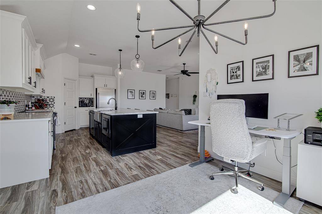 The kitchen is a standout feature, complete with gorgeous granite countertops, updated stainless steel appliances, a large center island with built-in microwave, breakfast bar seating, stylish tile backsplash, and a walk-in pantry. There's no shortage of cabinet or counter space here.