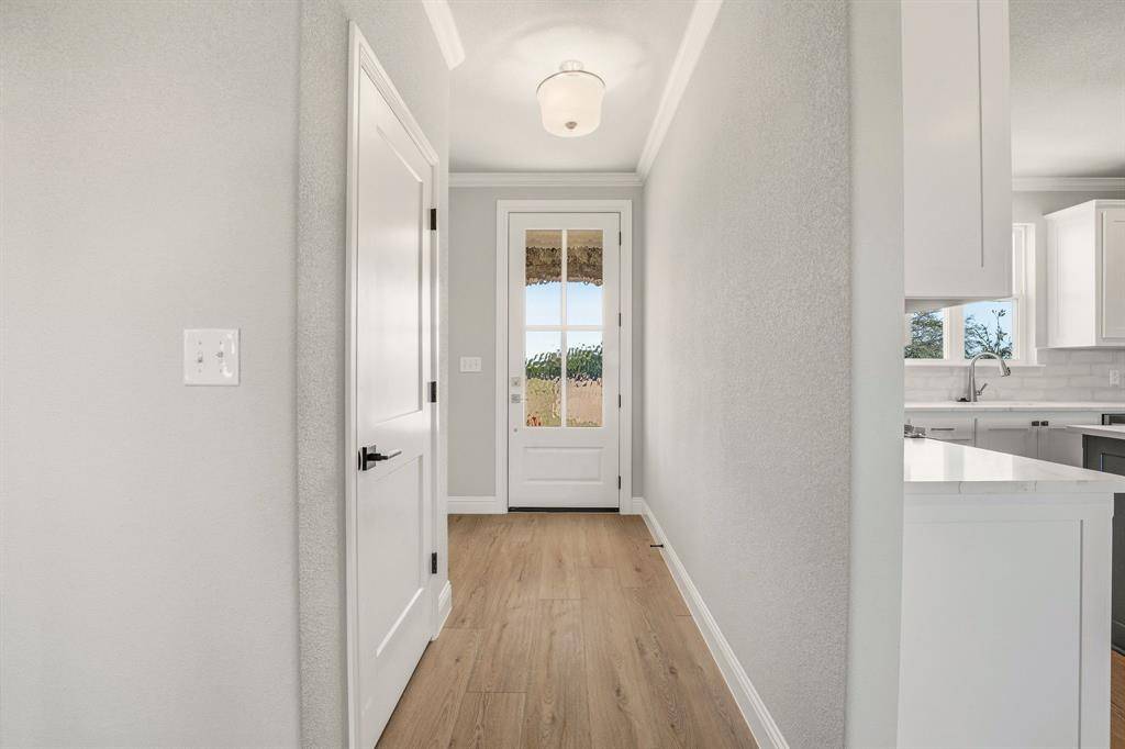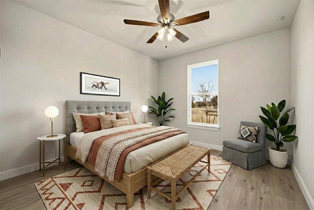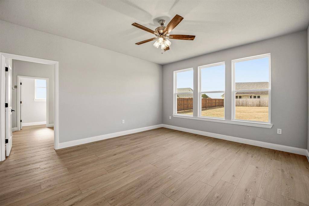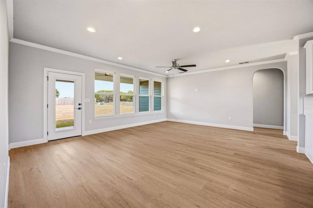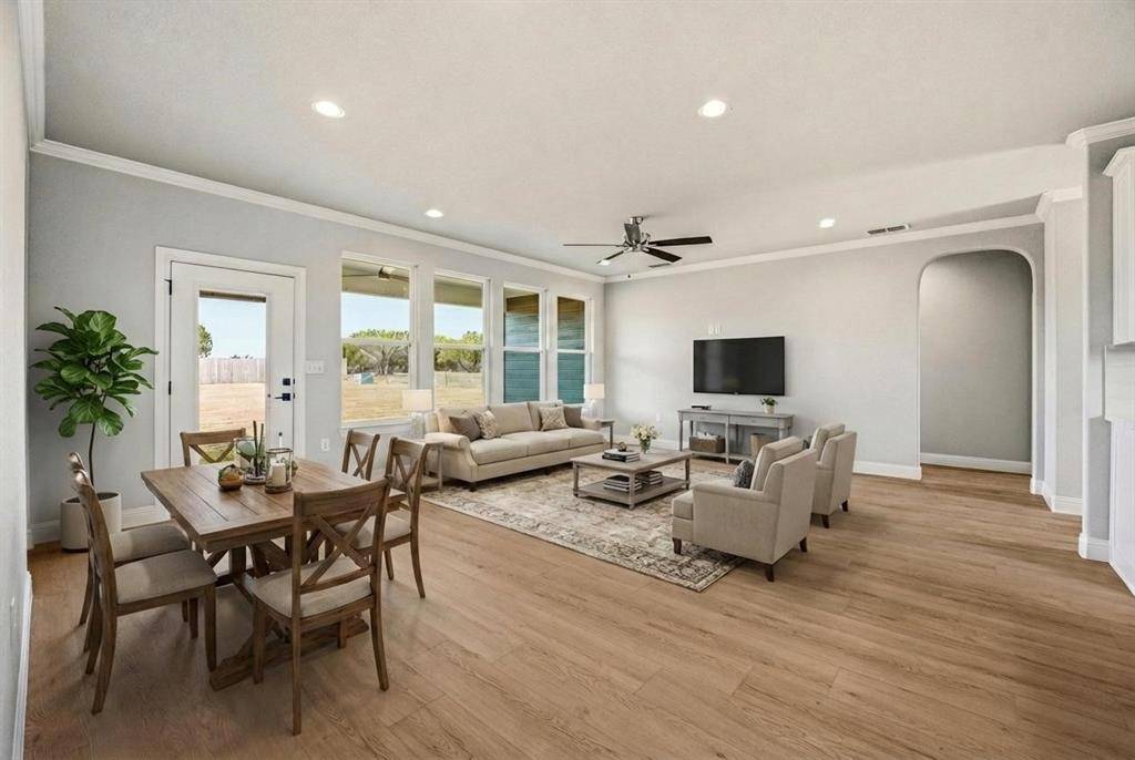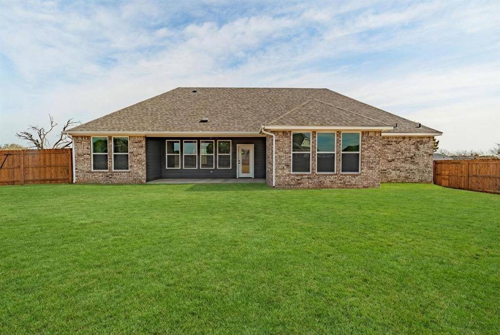 Discover this stunning new construction by Roffino Custom Homes, offering 3 bedrooms, 2 baths, and a versatile bonus room. The spacious open-concept layout seamlessly connects the living, dining, and kitchen areas—perfect for both everyday living and effortless entertaining. The gorgeous kitchen features abundant cabinetry, quartz countertops, and a thoughtfully placed sink with a serene view. A generous pantry and ample storage make organization a breeze. The inviting primary suite is filled with natural light and boasts a spa-like bath with a large walk-in shower and an impressive master closet. Two secondary bedrooms share a well-appointed full bath. Enjoy outdoor living on the spacious covered patio, overlooking a HUGE backyard complete with a 6-foot privacy fence. This lot borders a 13 acre rural property, giving extra privacy and beautiful views of the Texas countryside. Bonus features include a full sprinkler system, multiple extra parking spaces in the driveway, rain gutters, and spray foam insulation making this home very energy efficient. Situated on a quiet cul-de-sac with NO HOA, this home offers peace, convenience, and exceptional quality.