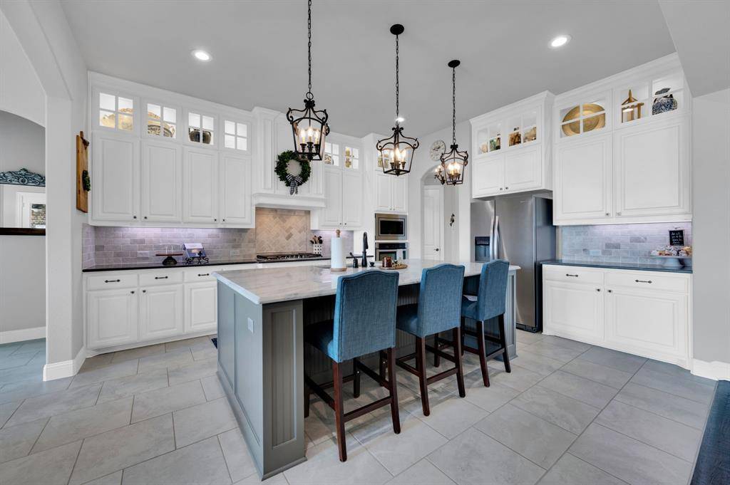 The OPEN-CONCEPT LIVING ROOM AND KITCHEN are remarkable, creating a seamless flow for family gatherings and entertaining. The living room includes CUSTOM BUILT-IN CABINETS on both sides of the fireplace, providing elegant storage and display space. The kitchen is a chef's dream with QUARTZ COUNTERTOPS, an oversized island with a DOUBLE OGEE EDGE detail, and abundant cabinet space, combining style and function in the heart of the home.