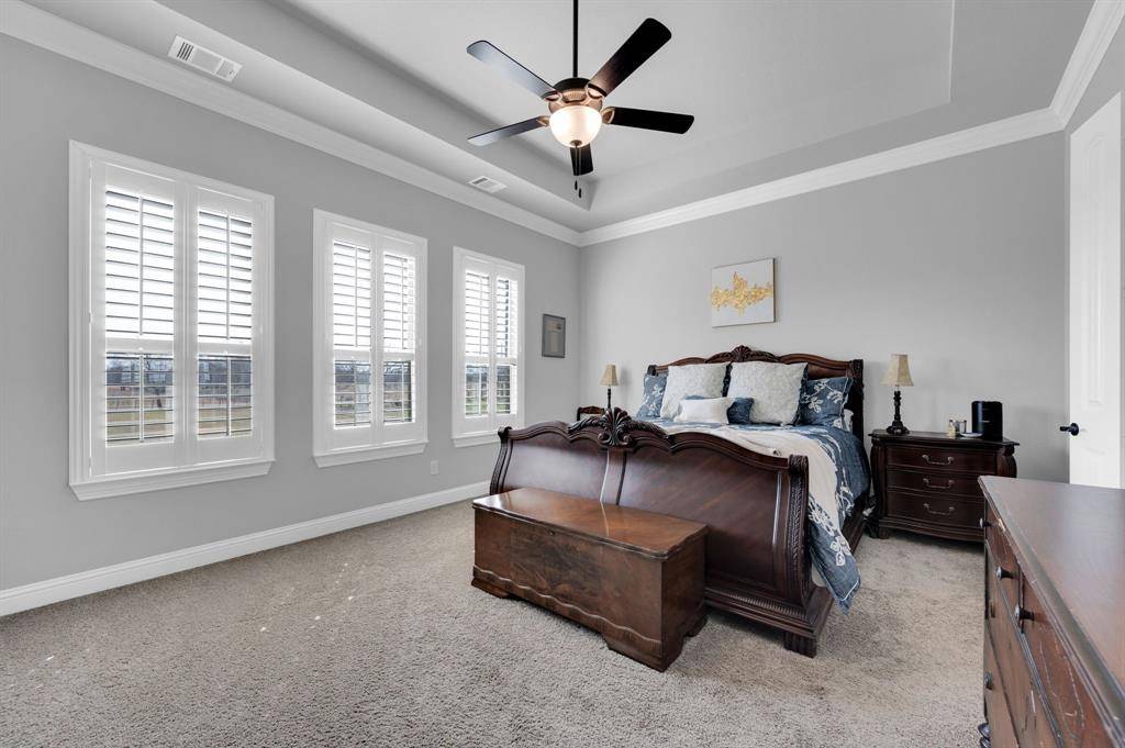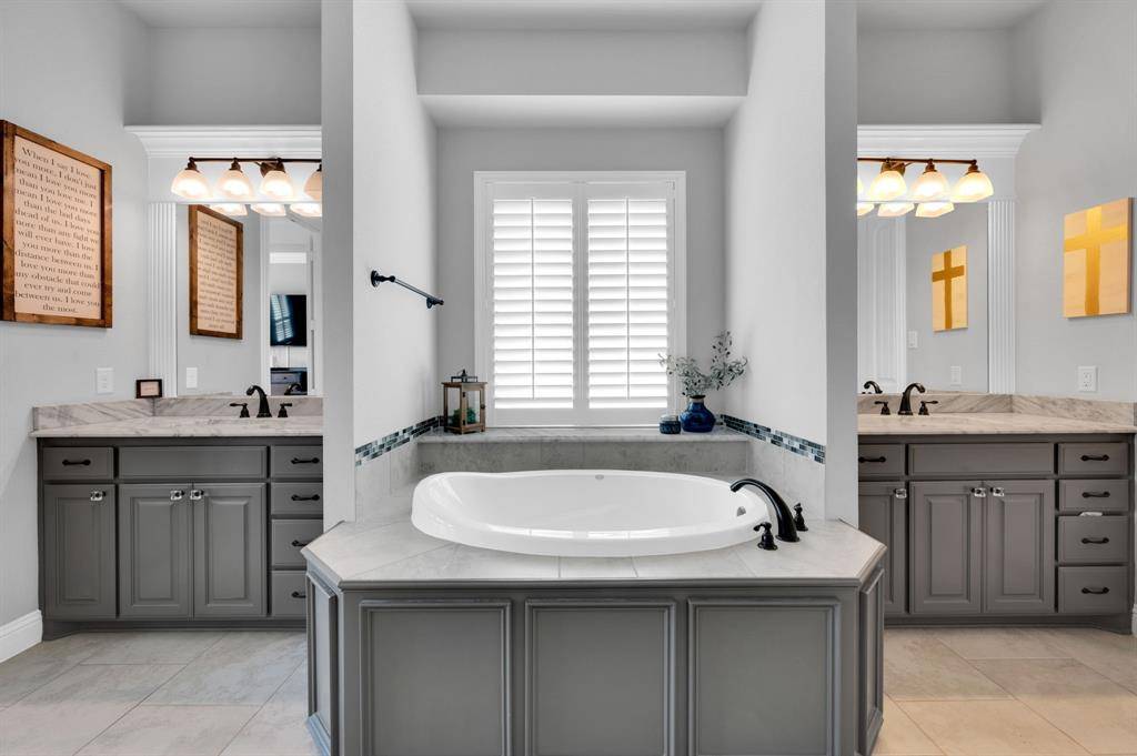 PLANTATION SHUTTERS adorn every window, with MOTORIZED SHUTTERS in the living room and breakfast nook for convenience and sophistication.