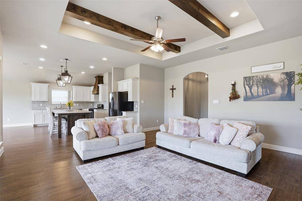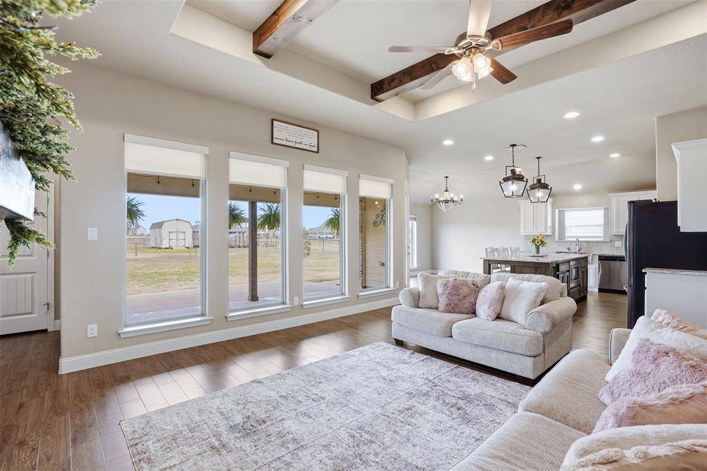 Inside, the open layout connects the main living areas, highlighted by wood-look tile flooring, decorative ceiling beams, and a fireplace that anchors the space. The kitchen is designed for function and gathering, featuring granite countertops, a large island with seating, gas range, and reverse osmosis filtered water at the sink.