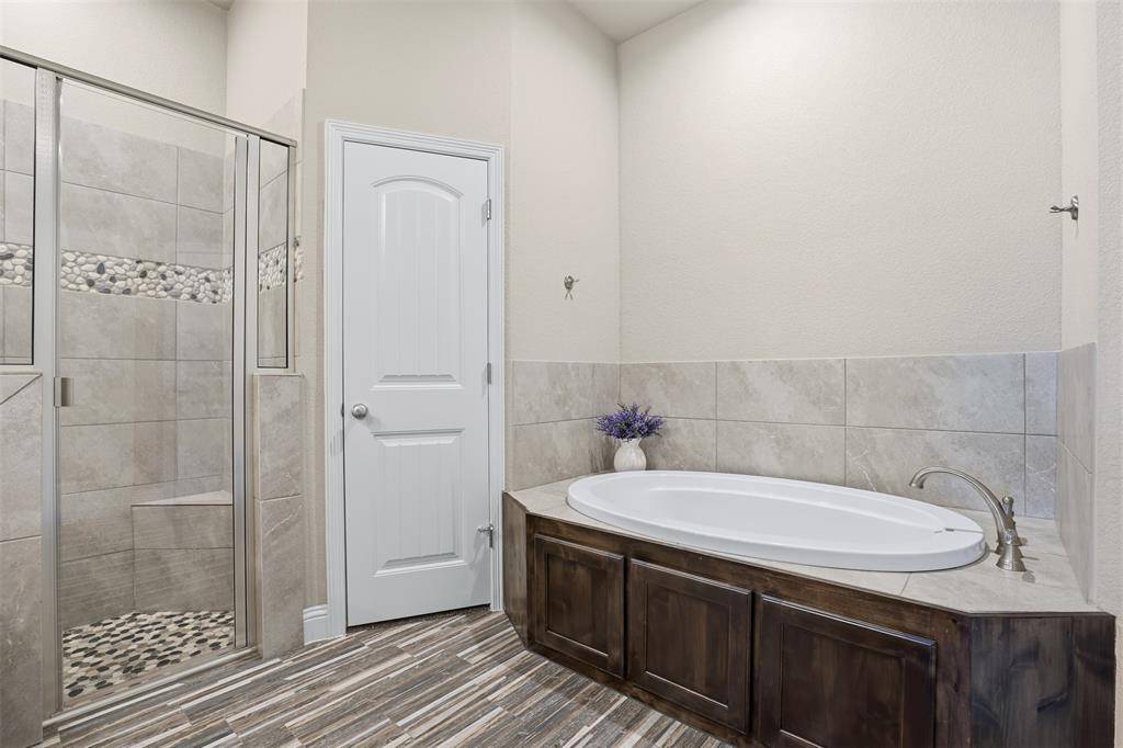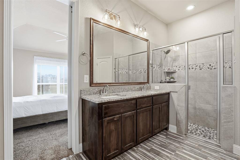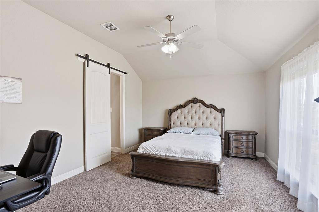The primary suite includes a tiled shower, garden tub, dual sinks, and dual walk-in closets. Secondary spaces are well-sized, and both bathrooms feature upgraded finishes. Spray foam insulation, a tankless water heater, keyless entry, security system with cameras, and a roof and gutters replaced in 2025 add long-term value and efficiency.