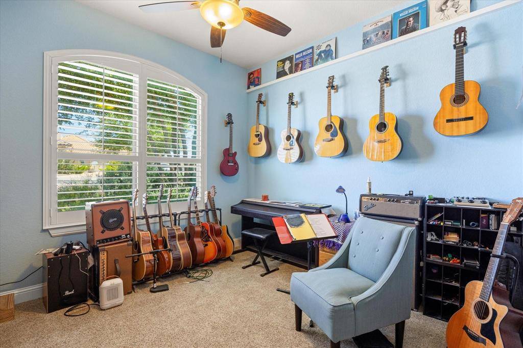 This beautiful 3-bedroom, 2-bathroom with and office that could be a 4th bedroom home showcases classic southwestern architecture with an authentic Spanish tile roof. Living room, kitchen and dining spaces are open to one another perfect for hosting. The living room focal point is the floor to ceiling stone fireplace. The home office is right off the living room and features elegant french doors and a closet. Gorgeous cherry cabinetry and granite countertops are found throughout the entire home. The kitchen has dual sinks, double ovens and views. Off the kitchen you'll find a spacious laundry with storage, sink and a walk-in pantry. The primary suite serves as a true retreat with dual vanities providing ample space for two, a relaxing soaking tub for unwinding, a separate shower for convenience, and a private toilet room. Generous storage with two spacious closets in the primary bedroom. Outside, the low-maintenance yard allows you to enjoy your free time while still having an attractive outdoor space. The home's positioning takes full advantage of beautiful sunsets and sunrises.