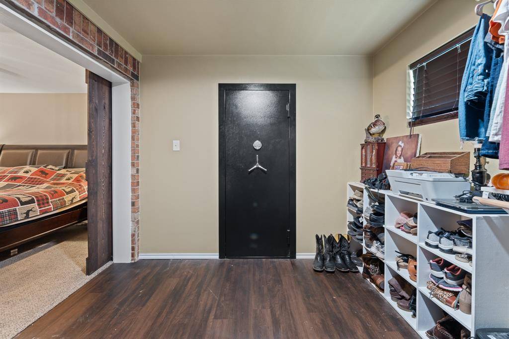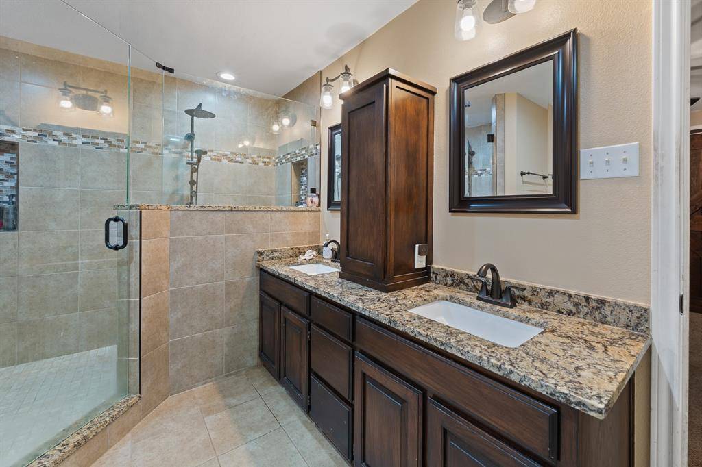 The spacious primary suite offers a relaxing retreat with a sliding barn door accent and an impressive ensuite bath featuring dual vanities, granite countertops, a large walk-in tiled shower with rain head, separate soaking tub, and a generous walk-in closet with built-ins and a built-in safe.