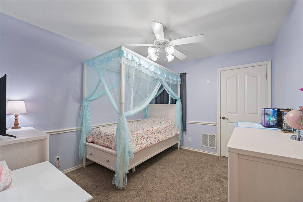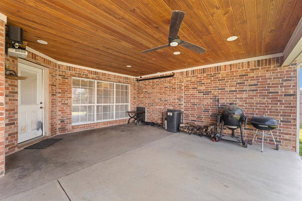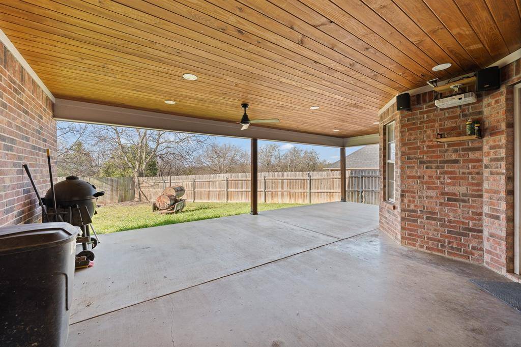 Step outside to enjoy the covered back patio with a beautiful wood plank ceiling, ceiling fans, recessed lighting, and plenty of space for grilling and entertaining. The backyard is fully fenced and ready for outdoor enjoyment.