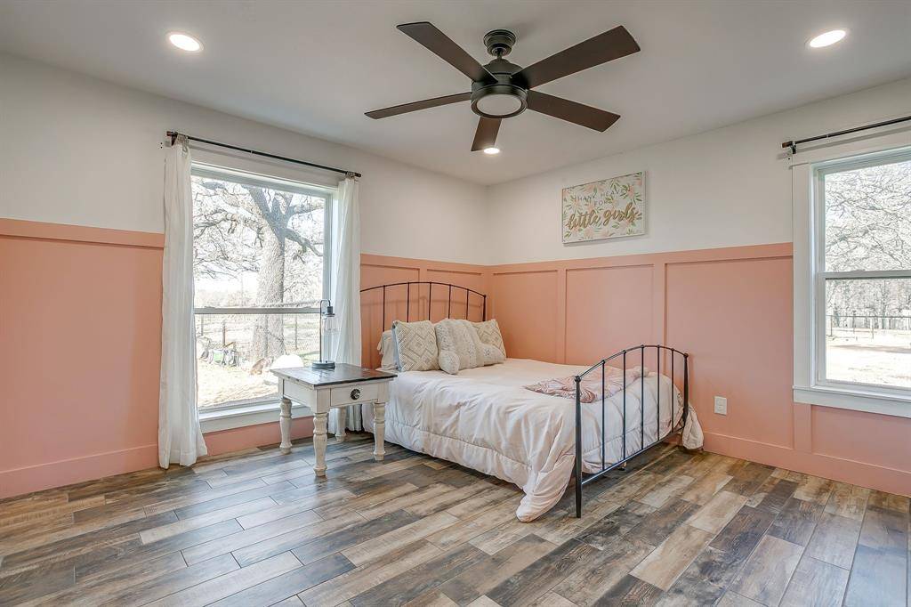 Completely reimagined and remodeled down to the studs, this stunning 3-bedroom, 2-bath home sits on 1.109 acres and offers the perfect blend of modern comfort and country freedom. Located in highly sought-after Godley ISD and just minutes from the Chisholm Trail Tollway, commuting into DFW is a breeze while still enjoying wide-open space and no HOA restrictions. Inside, every detail was thoughtfully designed. All-new electrical wiring includes dimmer switches and accent lighting. Skylights flood the home with natural light, highlighting the modern farmhouse touches like the shiplap breakfast nook and bricked accent wall. The living area centers around a large, real wood-burning fireplace, creating a warm and inviting gathering space. The spa-like primary bathroom features an oversized walk-in steam shower with customizable temperature and timer for the ultimate retreat experience. New cabinetry runs throughout the home, including built-ins in every closet for exceptional storage. Step outside to a spacious north-south facing patio designed for year-round enjoyment, complete with built-in surround sound speakers and a TV mount - perfect for entertaining without ever staring into the sun. The property also includes a separate 2-bedroom, 1248 sqft guest house, ideal for multi-generational living, rental income, or a home-based business. The current owner successfully operated an in-home daycare from the space, showcasing its flexibility. Additional major upgrades include new windows in both homes, foundation repair with a transferable lifetime warranty (2019), a new roof (2019), and a new well pump (2021) - providing the benefit of well water and long-term peace of mind. Modern updates, acreage, income potential, and prime location - this one truly has it all.