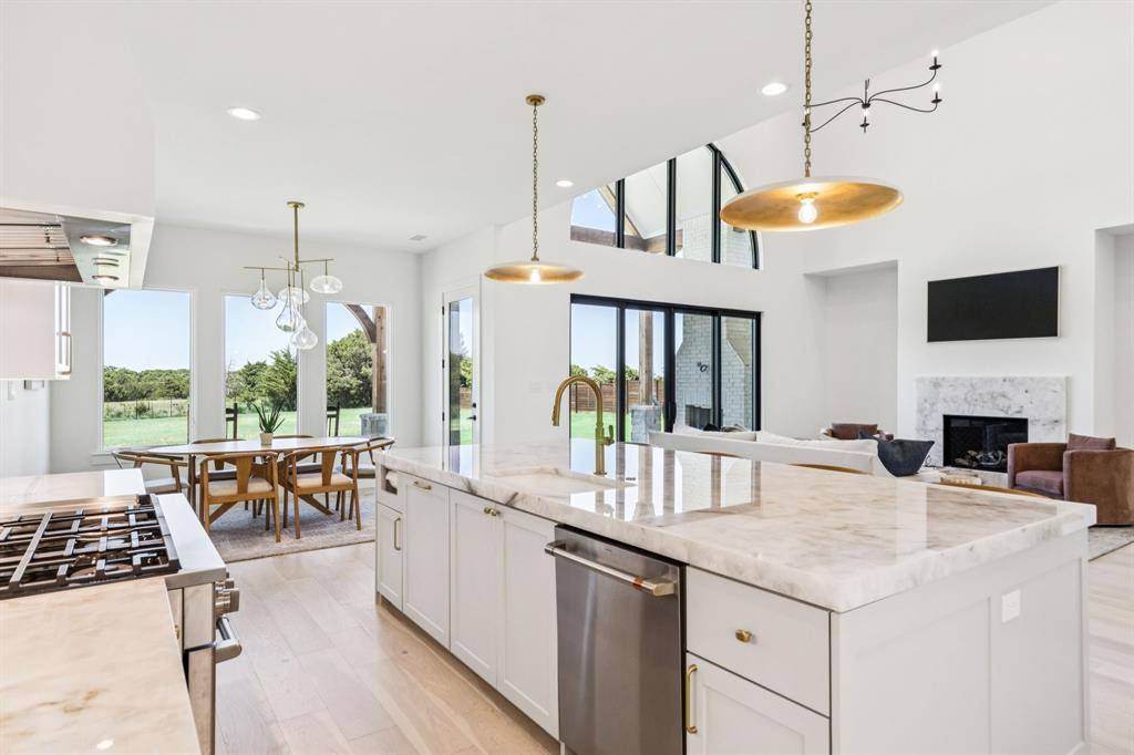 Home features a striking gas-log fireplace and a beautiful gourmet kitchen. Designed for both everyday living and upscale entertaining, the kitchen features an oversized island, abundant custom cabinetry, a HUGE walk-in pantry, and a sunlit breakfast nook. The formal dining room offers the perfect setting for hosting memorable dinners and celebrations.