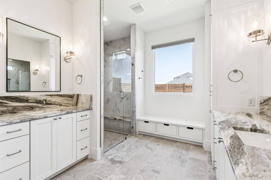 The primary suite serves as a luxurious sanctuary. Spa-inspired bath complete with dual vanities, a bidet, an oversized walk-in shower, and his-and-hers walk-in closets with custom built-in storage.