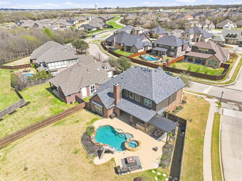 Step outside to your private entertainer's paradise! The backyard features a sparkling pool with slide, waterfall, and hot tub. The covered patio is fully equipped with a wood-burning fireplace, built-in grill, refrigerator, and ample seating space — making this outdoor living area truly exceptional for gatherings year-round.
