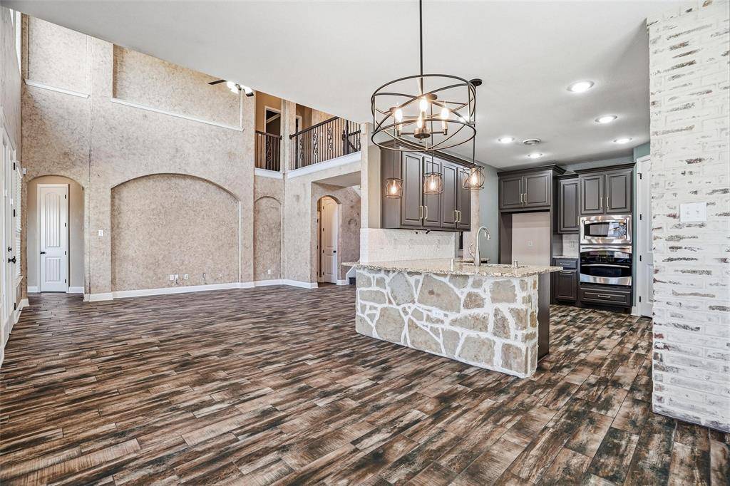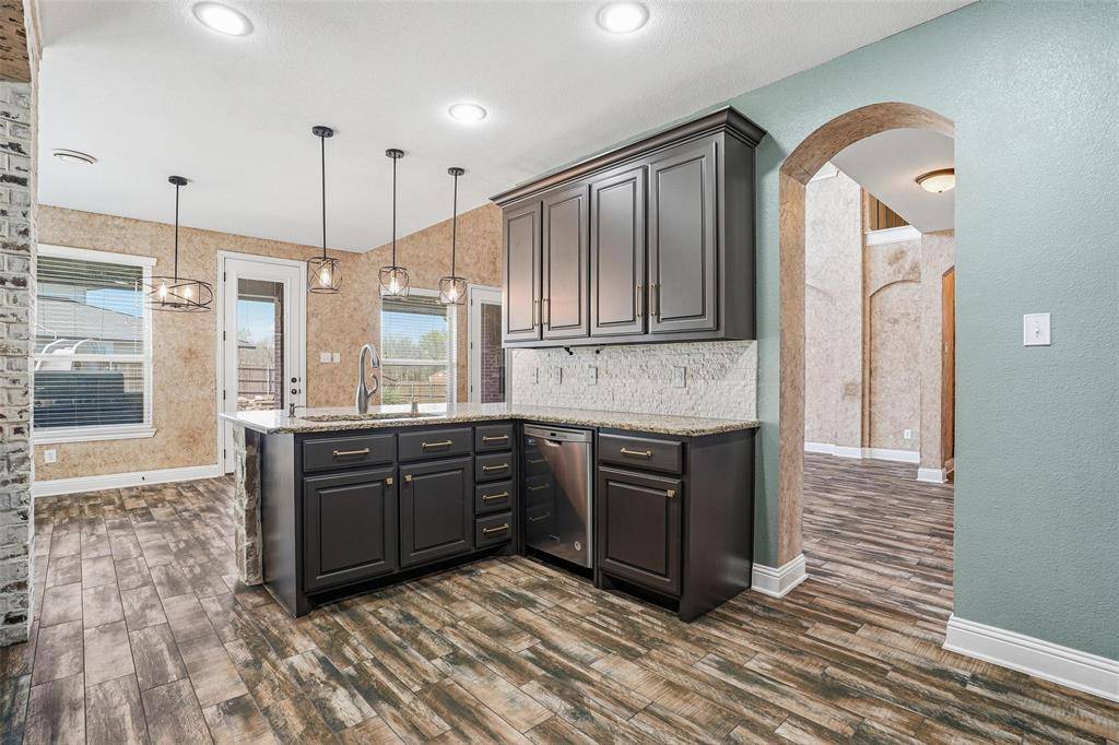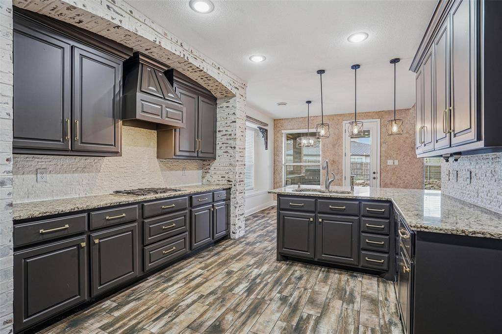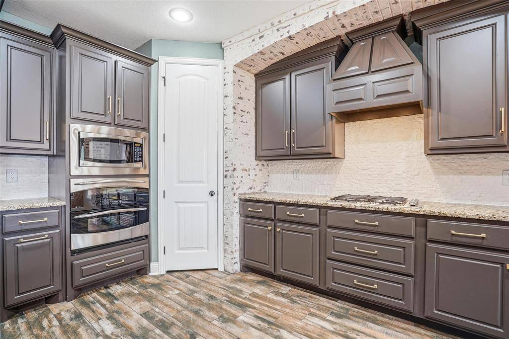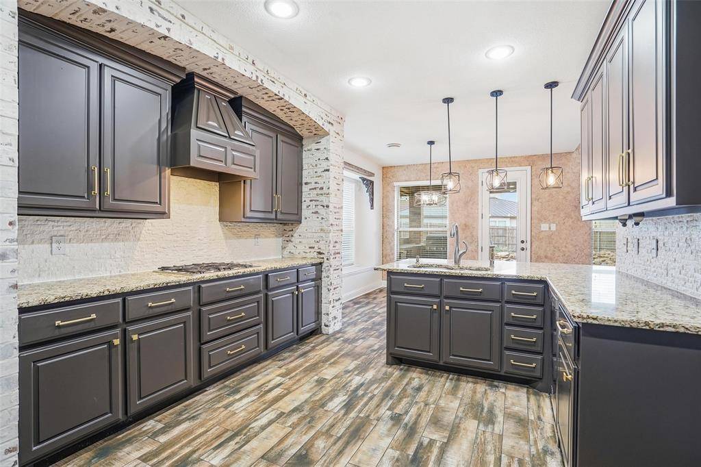 The kitchen is a chef's delight, complete with abundant cabinetry, breakfast bar, gas cooktop, eat-in dining space, and a charming brick accent wall that adds warmth and character.