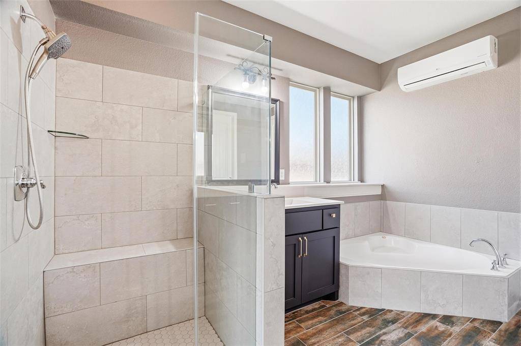 The primary suite is conveniently located downstairs and offers a luxurious ensuite bath with separate vanities, soaking tub, separate shower, and a large walk-in closet.