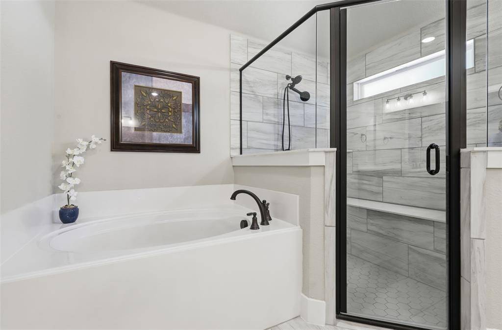 Windows spanning the entire back of the home fill the space with natural sunlight and showcase the beautifully maintained landscape beyond. The primary suite is a true retreat, complete with a generous sitting area framed by elegant bay windows. The en-suite bath features a large garden tub, an oversized walk-in shower with a built-in bench, and an impressive walk-in closet.