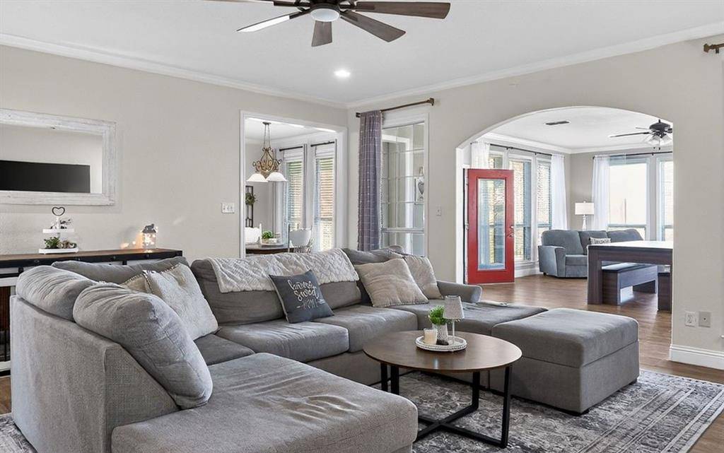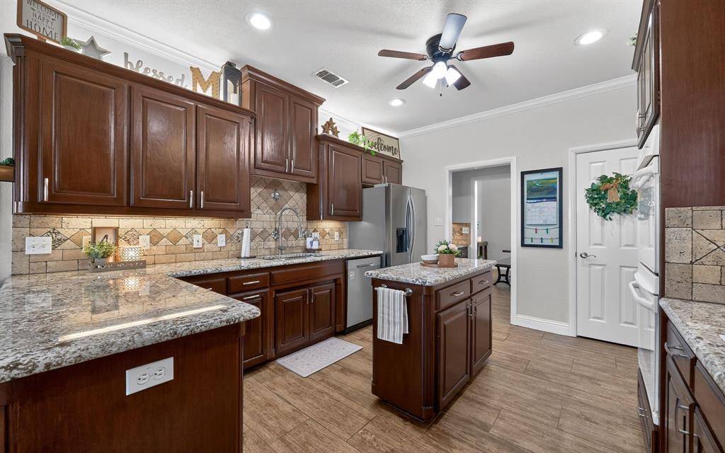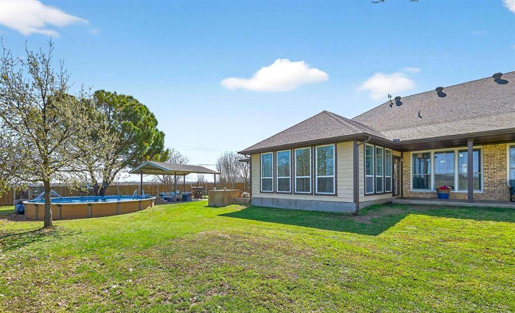Beautifully maintained custom home on a corner lot near the shores of Lake Pat Cleburne! Updated kitchen with granite countertops, large island, double ovens, coffee bar, spacious pantry, and abundant cabinetry. Porcelain tile flooring throughout main living areas. Large living room opens to a bright Florida room with scenic views! Primary suite features dual vanities, custom walk-in shower with body jets, and generous walk-in closet. Fourth bedroom works well as a home office. Generous covered porches in both front AND back of home! Bonus storm shelter just off the back porch! Additional features include but not limited to: a 20x30 workshop with electricity and loft storage, 30x18 covered RV or boat parking, and a swimming pool. 35k in recent improvements & custom upgrades!!!