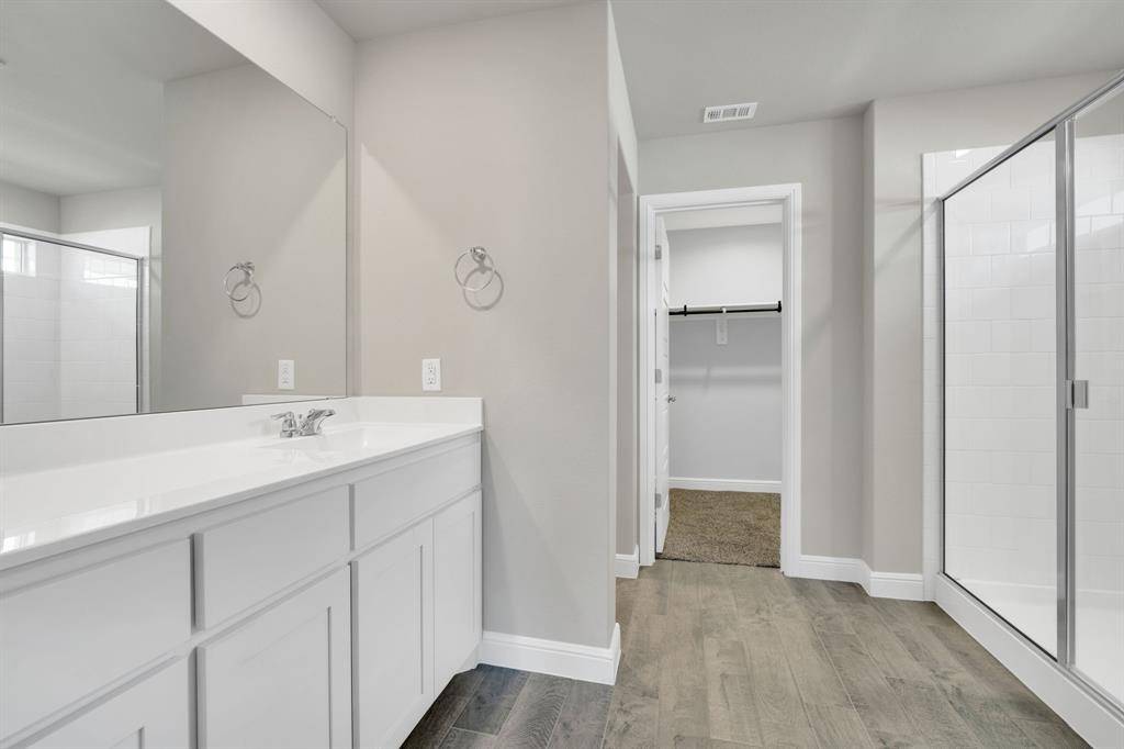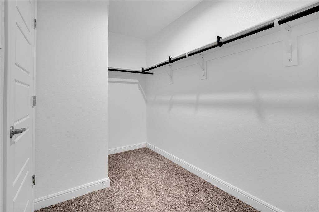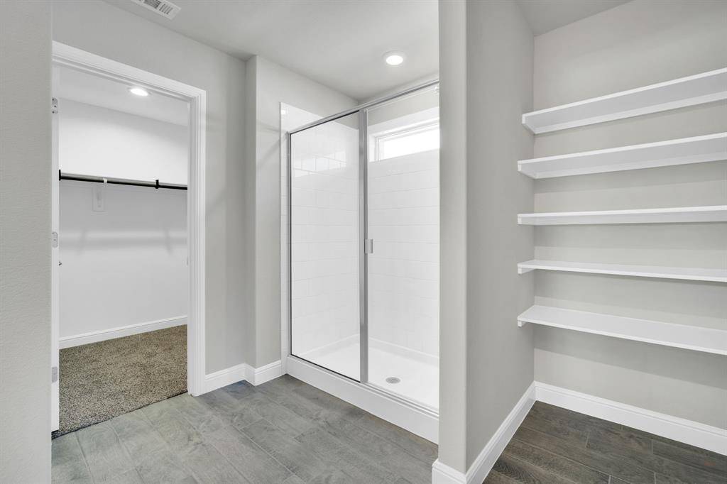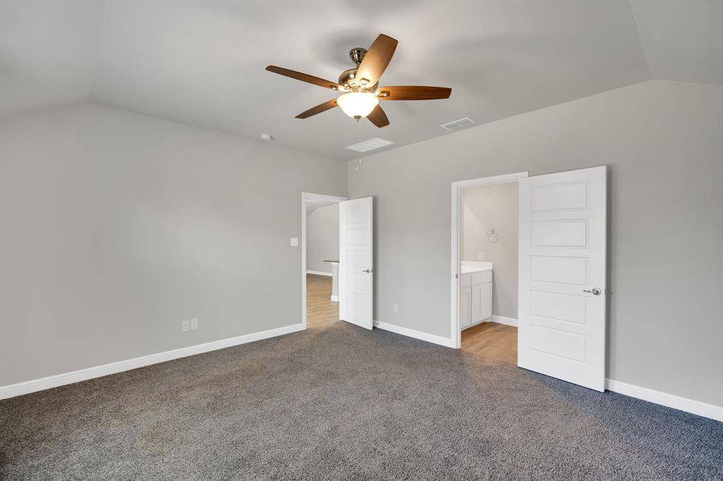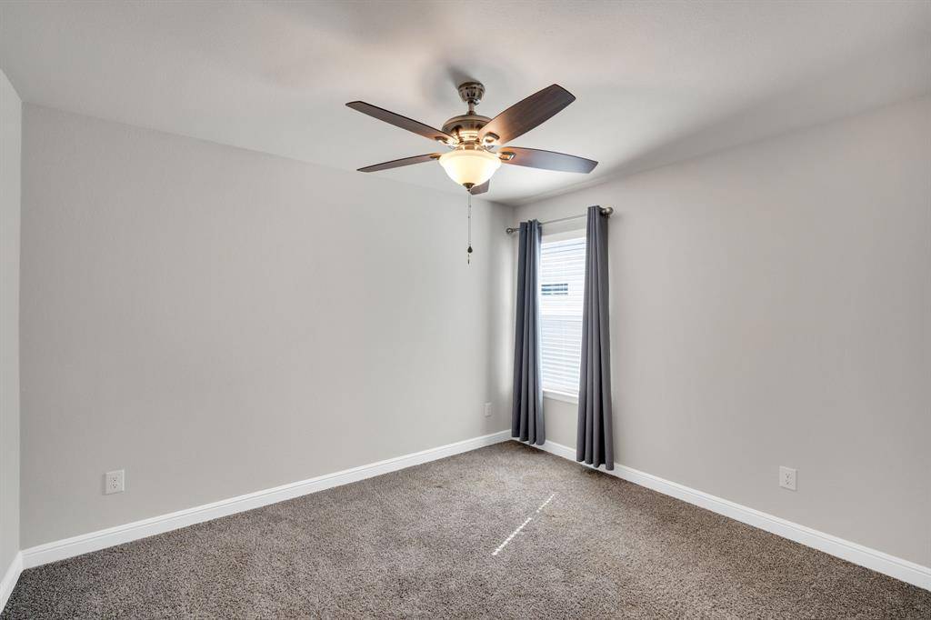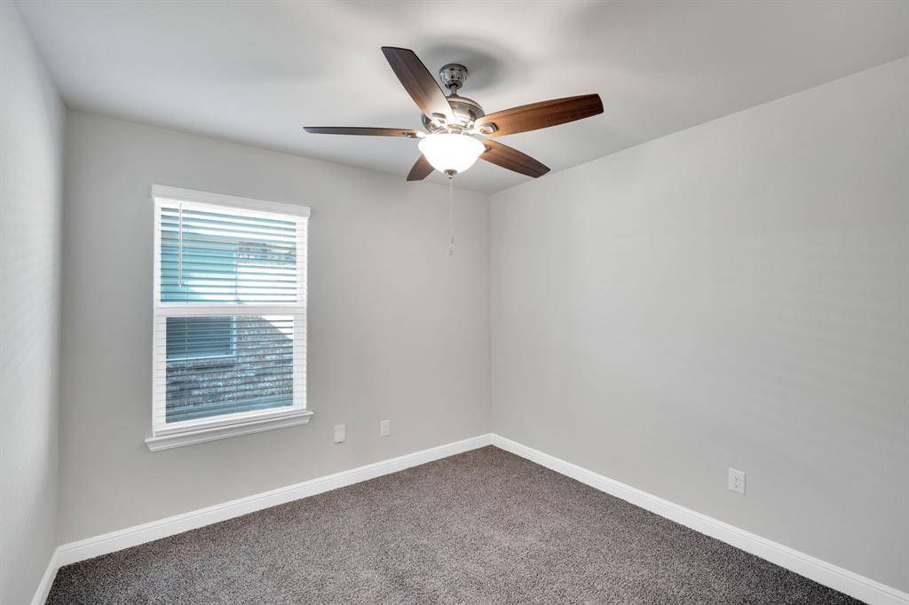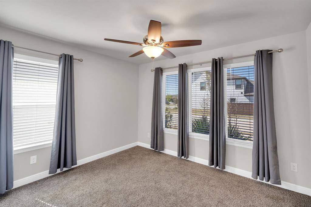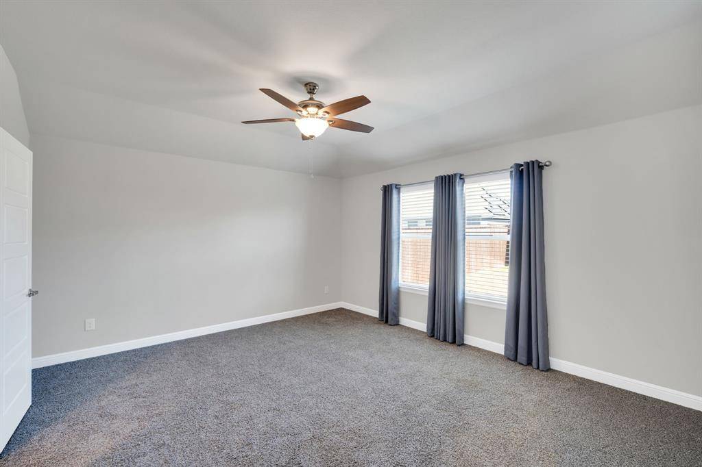 The primary suite offers a true retreat with plush carpet, a ceiling fan, walk-in closet, and a spa-like bath featuring a tile surround walk-in shower and oversized vanity. Three additional bedrooms provide flexibility for family, guests, or a home office.