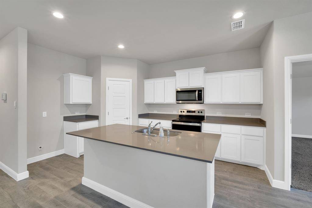 The chef-inspired kitchen is the heart of the home, boasting white shaker cabinetry, dark granite countertops, a center island with undermount sink, stainless steel appliances including electric range and microwave, plus a walk-in pantry with built-in shelving. The kitchen opens seamlessly to the spacious living and dining areas — perfect for entertaining.