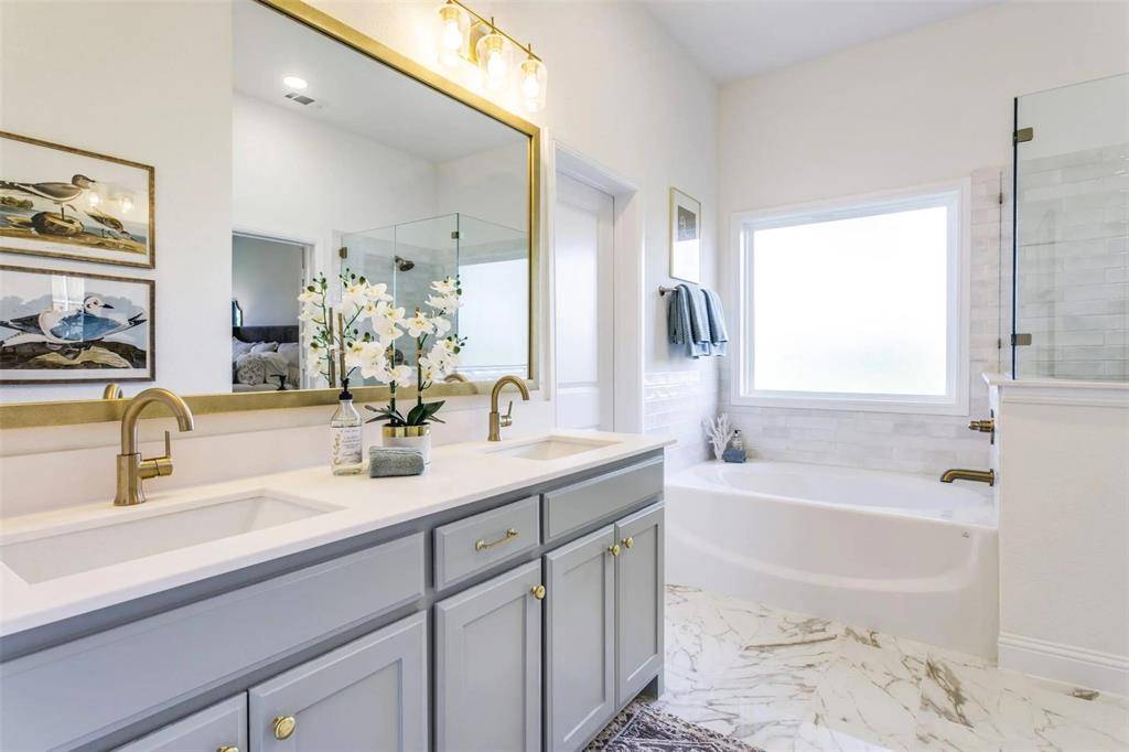 The modern kitchen with large island overlooks the main living area and features ample cabinetry and workspace. The primary suite provides a private retreat with dual vanities, soaking tub, and separate shower.
