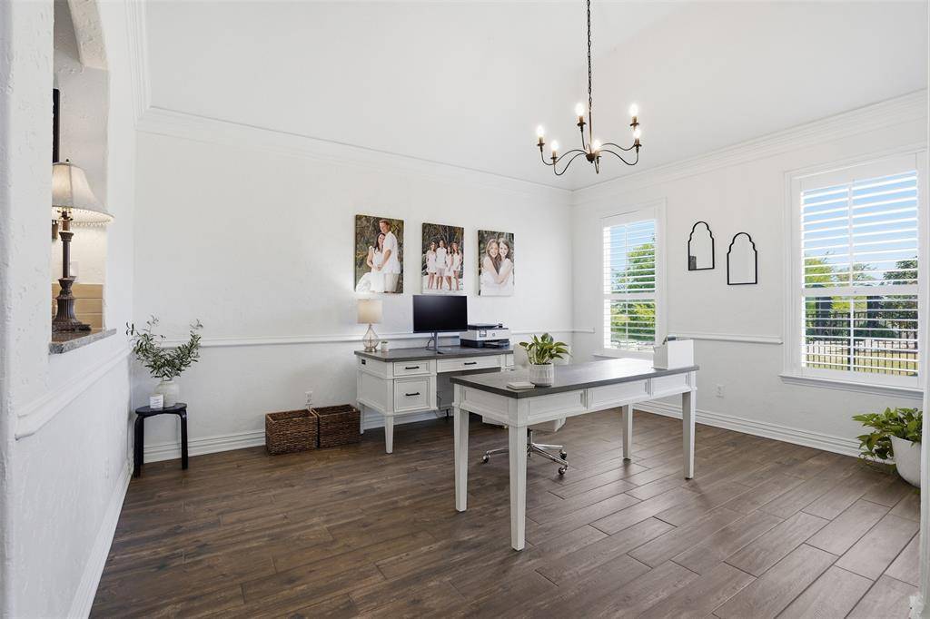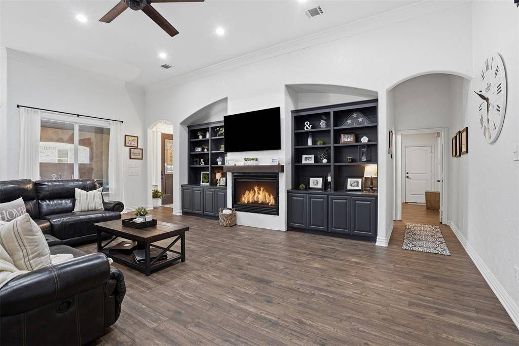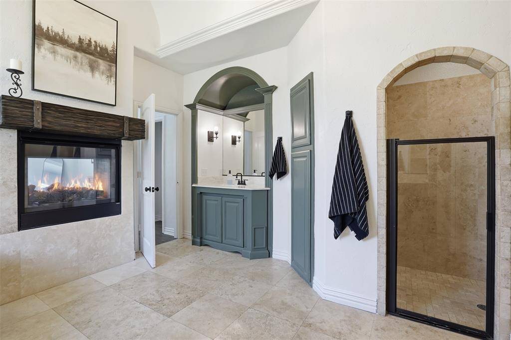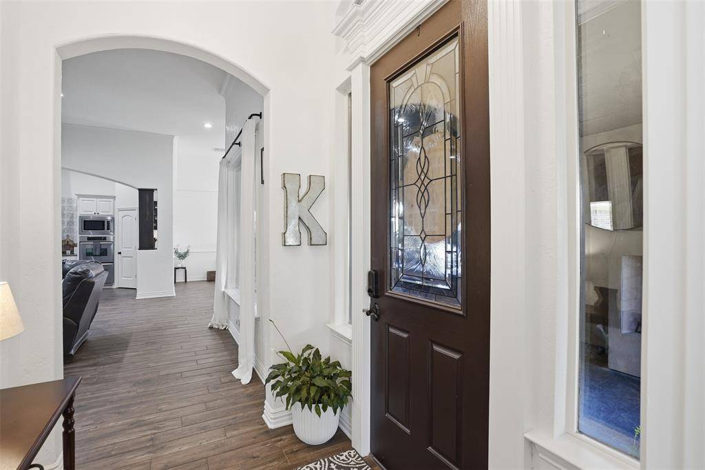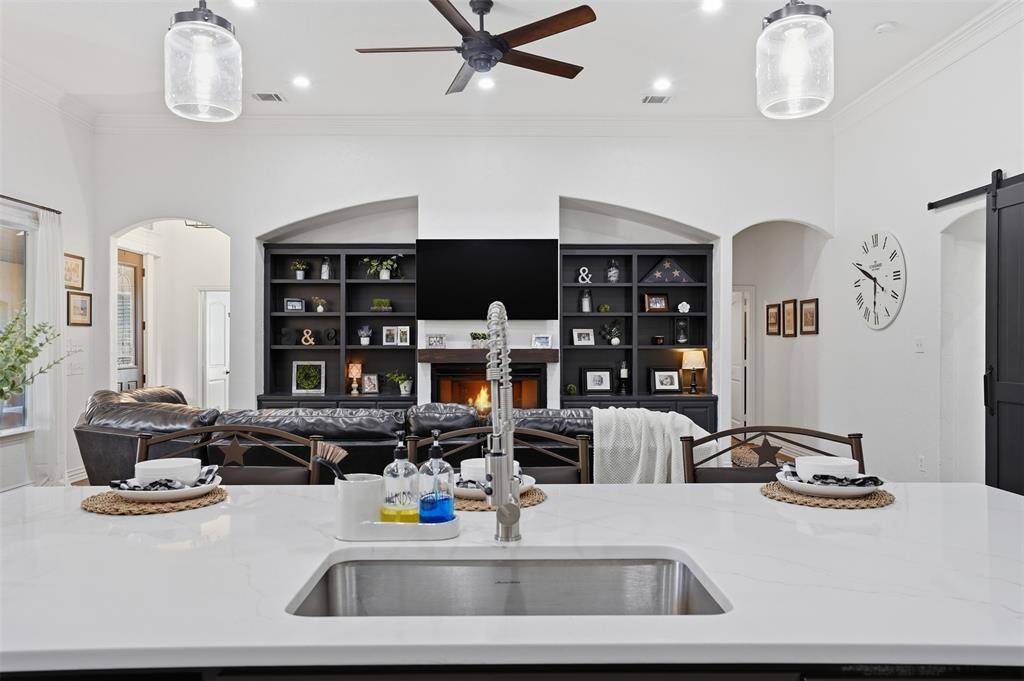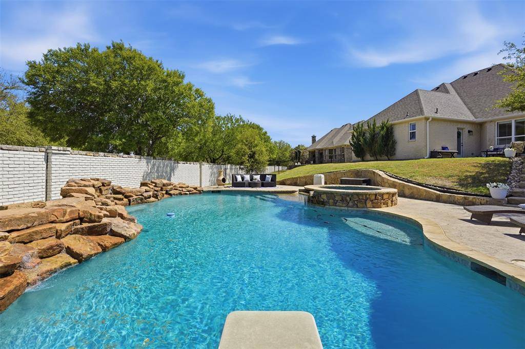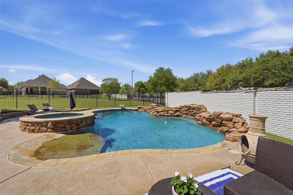 Welcome to this highly desirable, gated & quiet community of Reata West @ Team Ranch. Your luxury home awaits you! This one-story custom home beauty features an open concept layout, triple crown transom at front door, raised ceilings, crown molding, shutters, split bedroom arrangement, tile flooring & wood-look tile flooring, granite countertops, recessed lighting, arched & bullnose sheetrock, cedar beamed ceilings, upgraded lighting & hardware, chair railing, built-in hutch, gas log fireplace in large living room with stained cedar mantel & barn doors. The dining area doubles as a spacious home office or whatever fits your lifestyle. Gourmet kitchen features quartz island with breakfast bar, pendant lighting & undermount farm sink, wine cooler, granite countertops, tile backsplash, glass-front cabinets, stainless steel appliances including double wall gas ovens, gas cooktop, microwave, dishwasher, paneled & trimmed vent-a-hood & walk-in pantry, gutters, patio, wrought iron fencing, scored concrete, flagstone steps, sprinkler system & extensive landscaping. Primary, oversized bedroom with on-suite bathroom featuring a double-sided gas log fireplace, barrel ceiling, double vanities, separate walk-in shower & free-standing copper soaking tub plus walk-in, built-in closet. This large backyard is your relaxing escape! Serene oasis featuring a sparkling in-ground gunite pool with diving board, sun deck & raised spa with waterfall features. 2 car garage with floor epoxy & insulated overhead door & stamped concrete driveway. Additional guest parking located just steps away across the street. Enjoy your morning coffee or wind down your day in the enclosed porch courtyard complete with outdoor kitchen & wood-burning fireplace. Also, the perfect space to entertain! New gutters & roof in March 2026! Will be a perk when shopping for home insurance! Close to private schools. This is the true definition of unparalleled elegance adorned in picturesque surroundings. Welcome home!