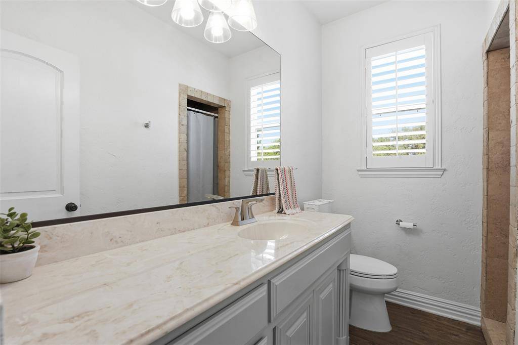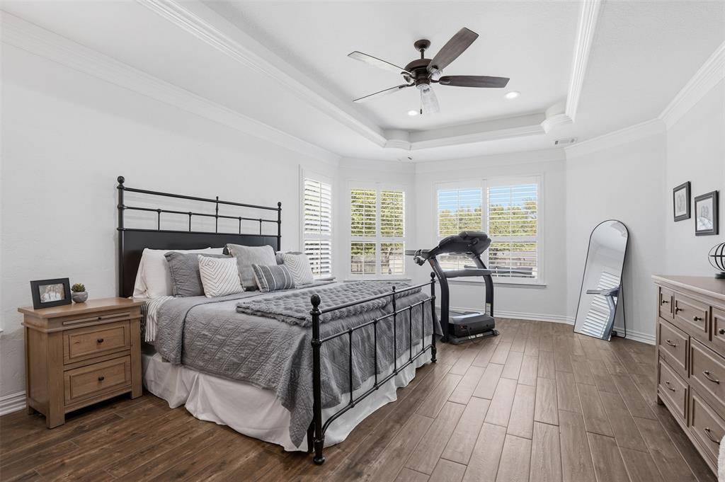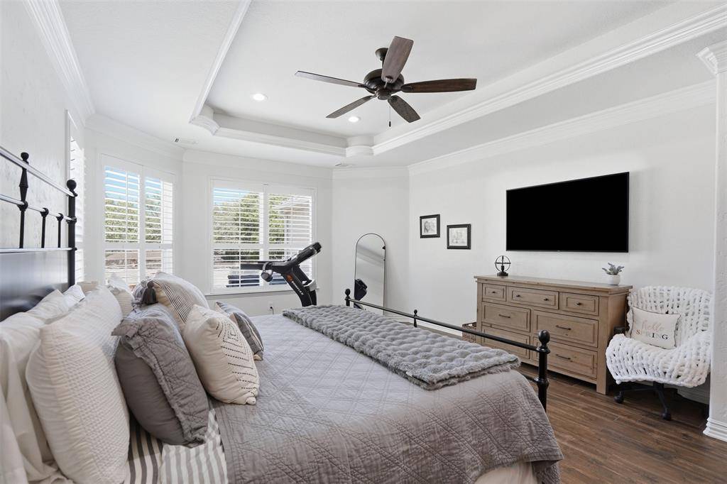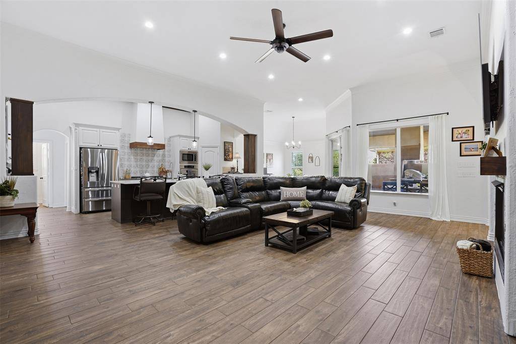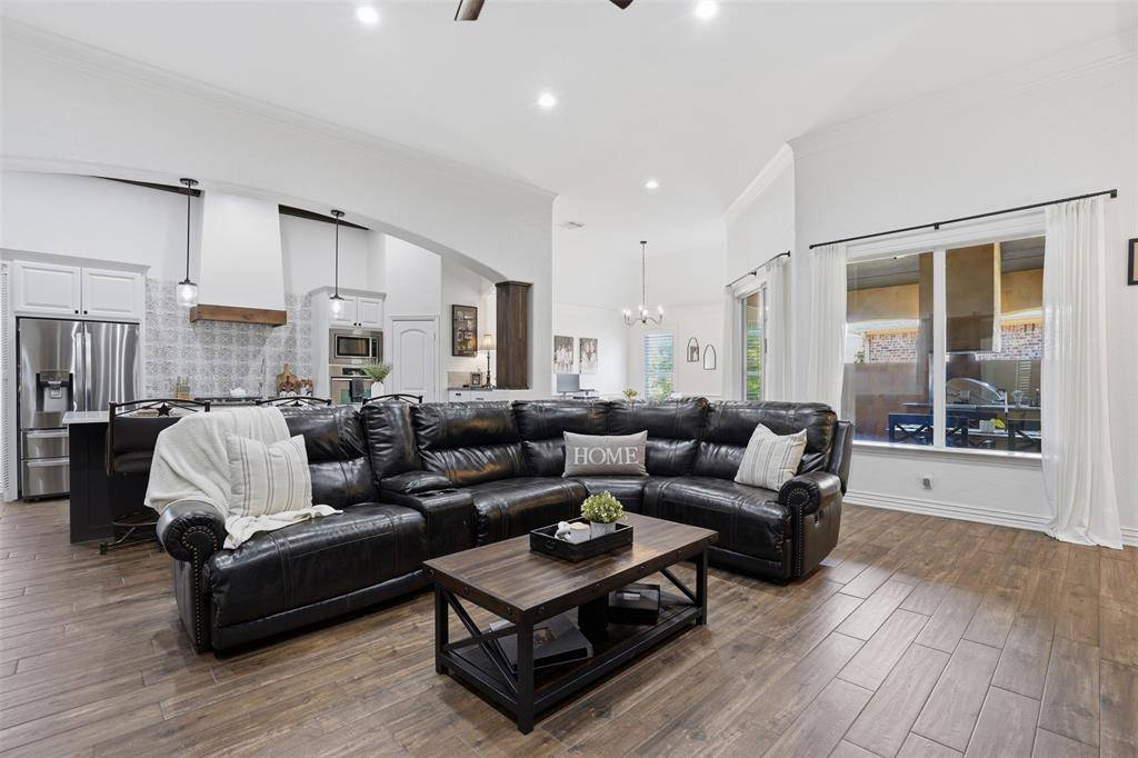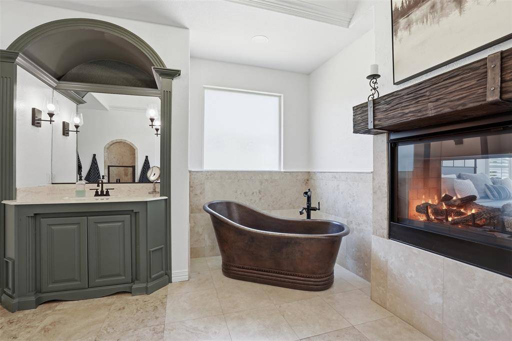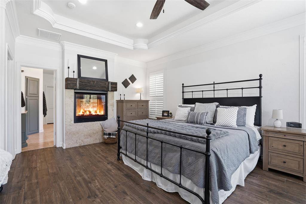 Welcome to this highly desirable, gated & quiet community of Reata West @ Team Ranch. Your luxury home awaits you! This one-story custom home beauty features an open concept layout, triple crown transom at front door, raised ceilings, crown molding, shutters, split bedroom arrangement, tile flooring & wood-look tile flooring, granite countertops, recessed lighting, arched & bullnose sheetrock, cedar beamed ceilings, upgraded lighting & hardware, chair railing, built-in hutch, gas log fireplace in large living room with stained cedar mantel & barn doors. The dining area doubles as a spacious home office or whatever fits your lifestyle. Gourmet kitchen features quartz island with breakfast bar, pendant lighting & undermount farm sink, wine cooler, granite countertops, tile backsplash, glass-front cabinets, stainless steel appliances including double wall gas ovens, gas cooktop, microwave, dishwasher, paneled & trimmed vent-a-hood & walk-in pantry, gutters, patio, wrought iron fencing, scored concrete, flagstone steps, sprinkler system & extensive landscaping. Primary, oversized bedroom with on-suite bathroom featuring a double-sided gas log fireplace, barrel ceiling, double vanities, separate walk-in shower & free-standing copper soaking tub plus walk-in, built-in closet. This large backyard is your relaxing escape! Serene oasis featuring a sparkling in-ground gunite pool with diving board, sun deck & raised spa with waterfall features. 2 car garage with floor epoxy & insulated overhead door & stamped concrete driveway. Additional guest parking located just steps away across the street. Enjoy your morning coffee or wind down your day in the enclosed porch courtyard complete with outdoor kitchen & wood-burning fireplace. Also, the perfect space to entertain! New gutters & roof in March 2026! Will be a perk when shopping for home insurance! Close to private schools. This is the true definition of unparalleled elegance adorned in picturesque surroundings. Welcome home!