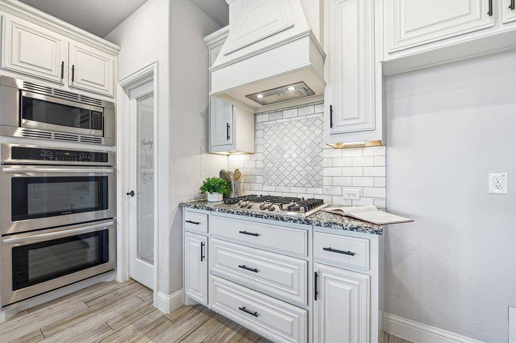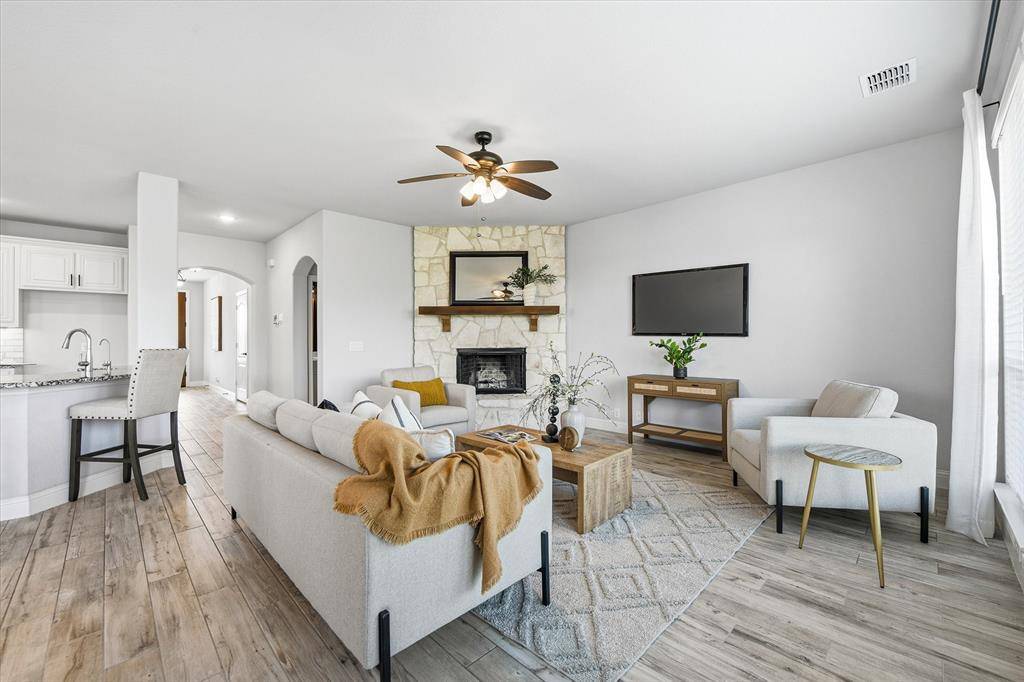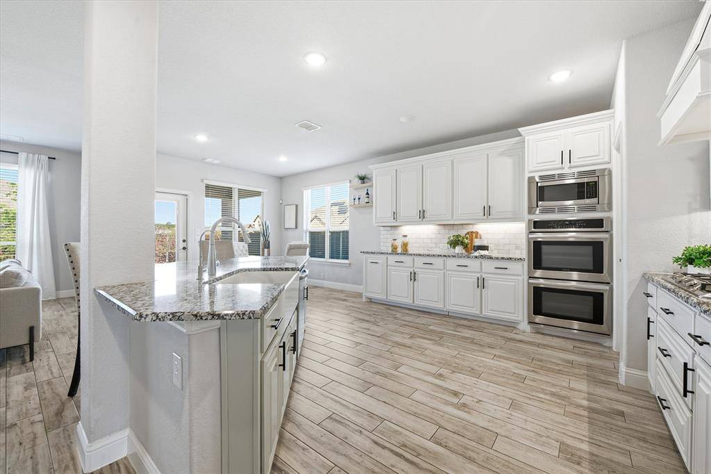 At the heart of the home, you'll find a bright and open-concept living, kitchen, and dining space highlighted by a striking floor-to-ceiling corner fireplace and durable wood-look tile flooring throughout the main level. The chef-inspired kitchen is designed to impress, complete with an oversized island, upgraded countertops and backsplash, double ovens, and a generous walk-in pantry.