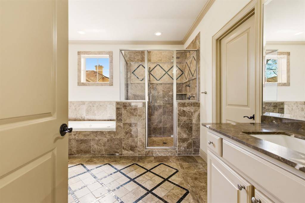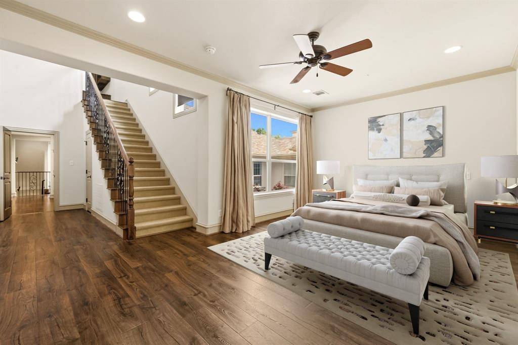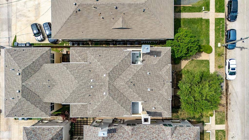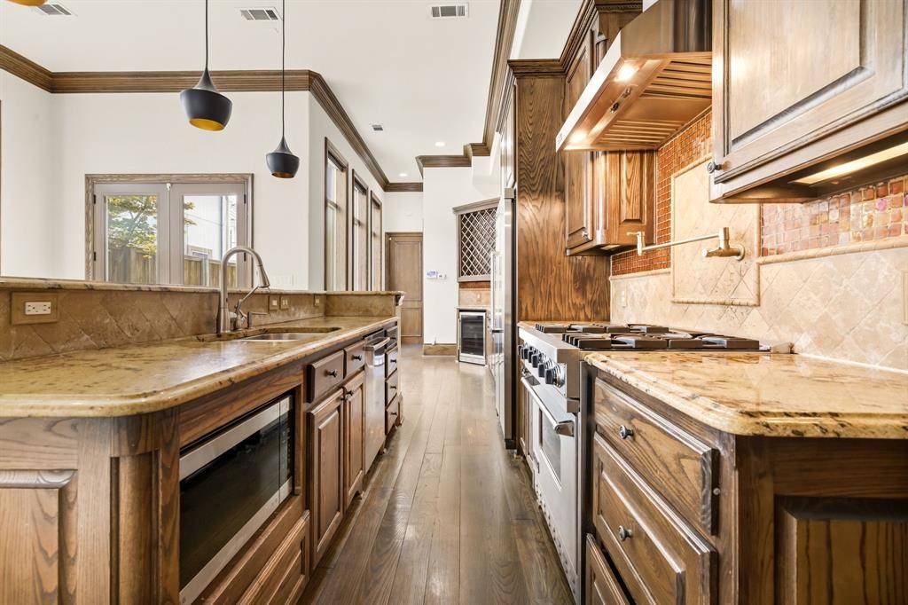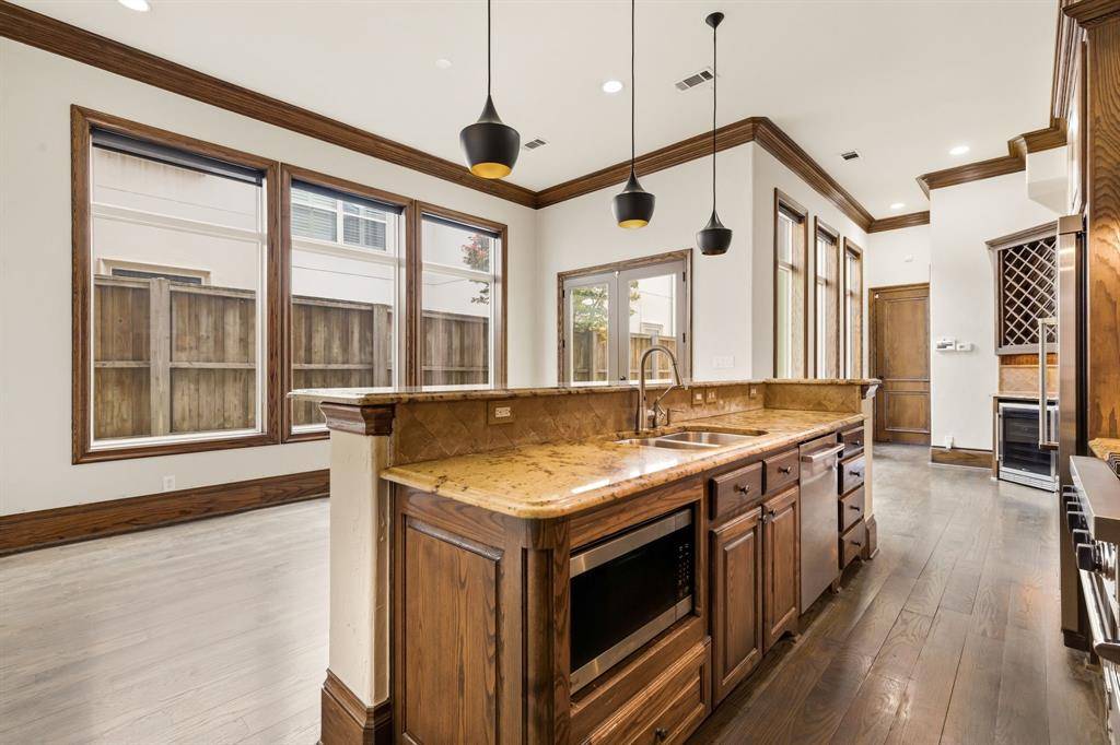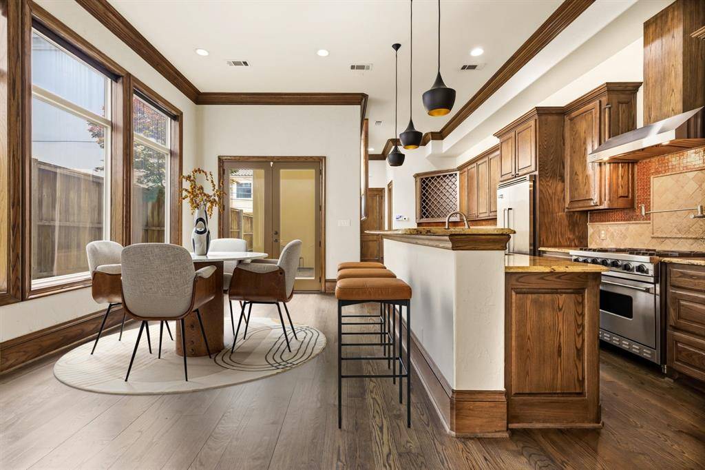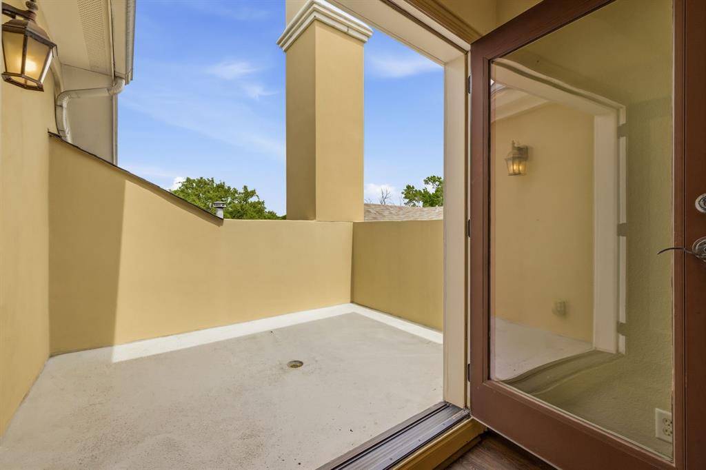 Situated in one of Oak Lawn's most sought-after locations, this striking three-level residence delivers the perfect combination of architectural character, thoughtful design, and low-maintenance luxury living. Soaring 15-foot ceilings, abundant natural light, and rich dark wood millwork set a sophisticated tone throughout. The main living area centers around a statement fireplace and flows seamlessly into the dining and entertaining spaces. The chef's kitchen is equally impressive, featuring Viking stainless steel appliances, a gas cooktop with pot filler, built-in refrigeration, an oversized island, and a spacious walk-in pantry. The primary suite is generously proportioned with a spa-inspired ensuite bath offering a soaking tub, oversized walk-in shower, and a large walk-in closet and a stairway to 3rd floor study. Additional bedrooms each feature private ensuite baths with high-end stone finishes. The third level offers a versatile bonus space complete with a wet bar, half bath, and private terrace, functioning beautifully as a media room, home office, or guest retreat. Custom window treatments throughout. Multiple terraces and balconies create three distinct outdoor entertaining areas. Artificial turf along the side yard and adjacent to the patio provides a clean, polished exterior that requires virtually no upkeep. Priced to make it your own. Moments from premier shopping, dining, and convenient access to major highways.
